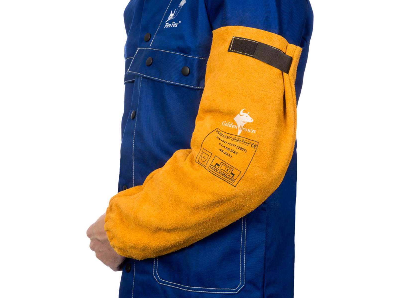 Svejseærmer fra Golden Brown er udformet i robust okse læderspalte, leveret som et par. Dette produkt tilbyder optimal beskyttelse under svejsearbejde med en minimumslædertykkelse på 1 mm. Praktisk burrelukning er til stede i den øverste ende, hvilket tillader en sikker og justerbar pasform. Desuden, for at sikre endnu større komfort og tilpasning, er ærmerne udstyret med elastiske bånd ved håndledsenden.