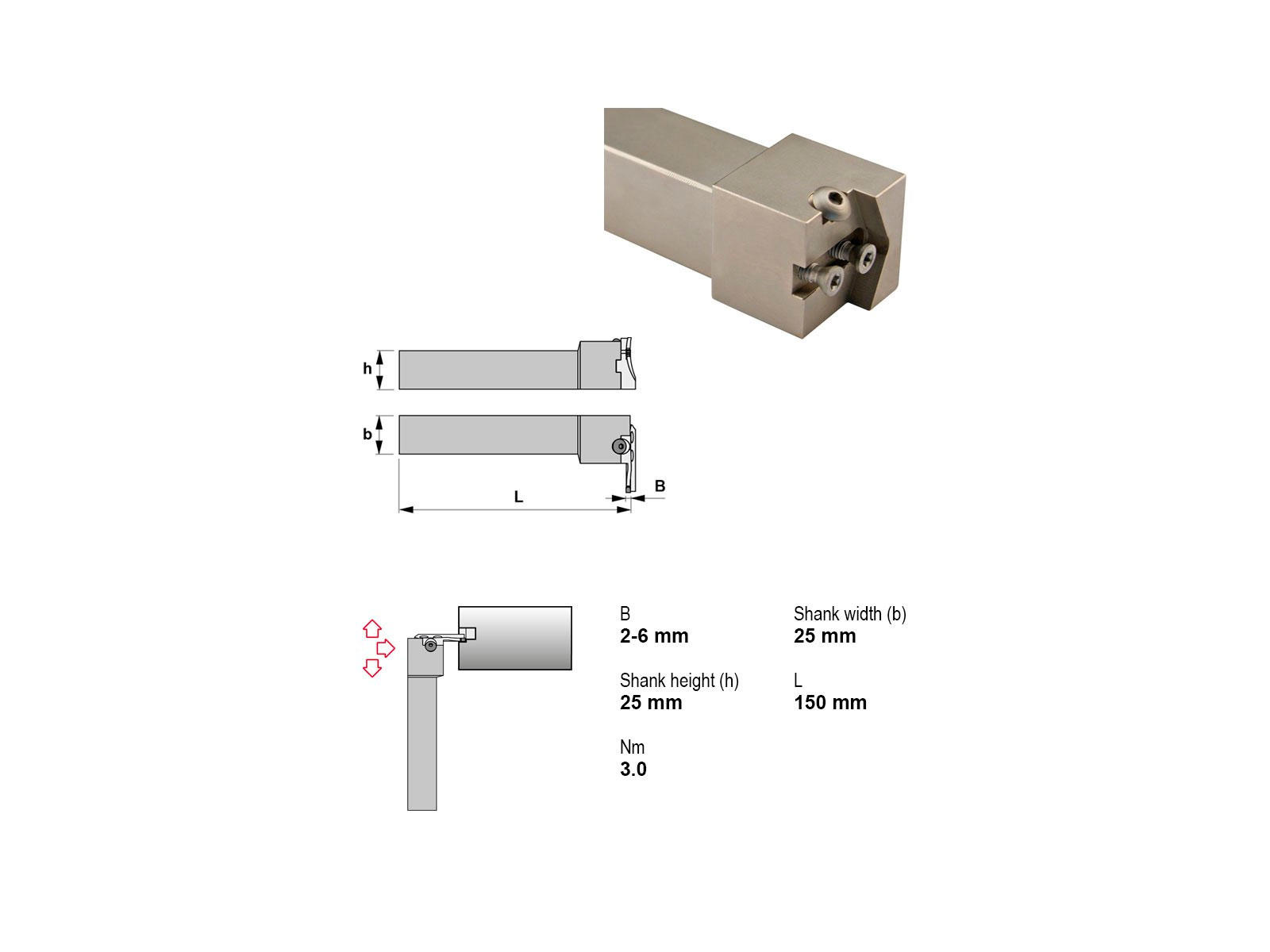 Canela CZFDL2525M26 stikstålsholderen er en robust og alsidig holder designet til præcis og pålidelig bearbejdning. Med sin modulære opbygning giver den fleksibilitet og nem integration i forskellige opsætninger. Ideel til CZFDL.. stikstål og leverer høj ydeevne uden køling.