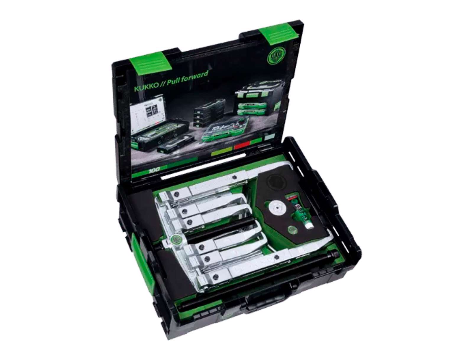 KUKKO K-2030-20 er et 15-delt universal-aftrækkersæt til 2- og 3-armet aftræk af store lejer, tandhjul og skiver i værksted og industri. Modulopbygningen muliggør syv varianter ved kombination af aftrækkerkroge, forlængere og traverser. Den robuste udførelse passer til tunge opgaver på produktionsudstyr og erhvervskøretøjer.