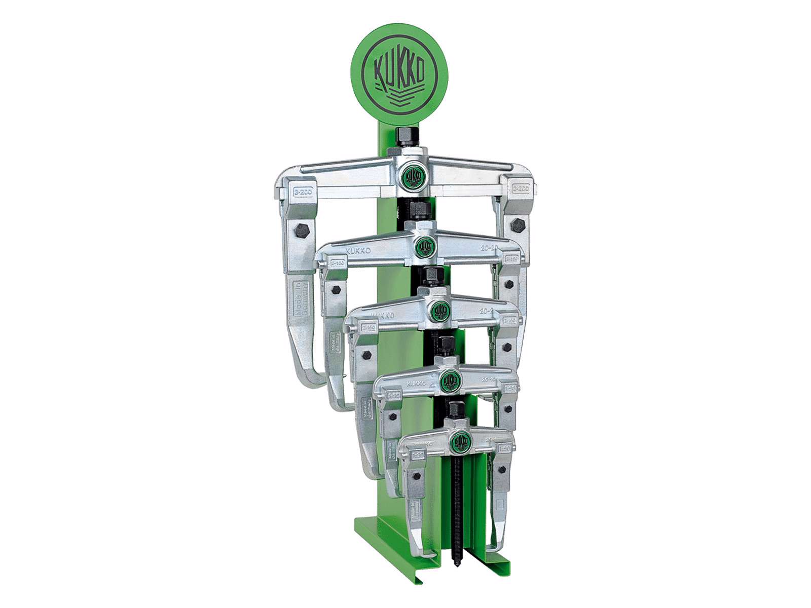 KUKKO 20-ST er et aftrækkersæt til værksted og industri til aftrækning af lejer, tandhjul og skiver. Sættet omfatter fem 2-armede universalaftrækkere med justerbare kroge samt stativ/holder (20-STL) til ordnet opbevaring og overskuelig præsentation. De 2-armede aftrækkere muliggør udvendig og indvendig aftrækning af komponenter, der er frit tilgængelige på aksler, og giver sikker, ikke-destruktiv afmontering.