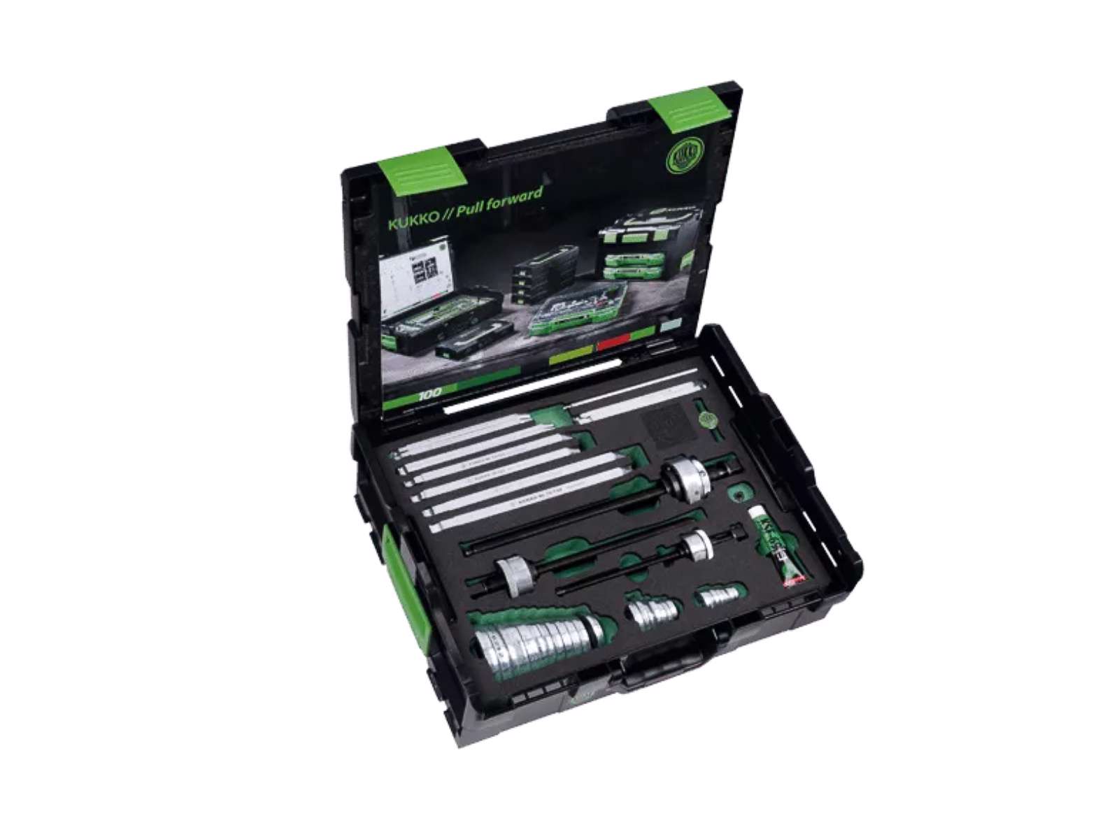 KUKKO K-70-A “PULLPO” er et komplet, indvendigt gribende aftrækkersystem til sikker demontering af rillekuglelejer, også hvor der ikke er støtte bag lejet. De specialudviklede kroge sikrer pålideligt greb og høj udtrækskraft, mens den enkle opbygning gør arbejdet hurtigt og skånsomt.
