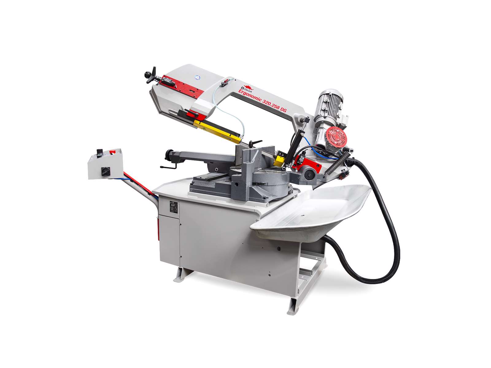 Bomar Workline Ergonomic 320.258 DG er en avanceret gravitationsbåndsav designet til præcise snit og langvarig holdbarhed. Med en robust støbejernsarm og et 27 mm højt savbånd er denne maskine ideel til bearbejdning af både korte og længere materialestykker. Det store drejebord sikrer stabilitet, og dens unikke design med roterende bord og arm eliminerer risikoen for skade på savbåndet.