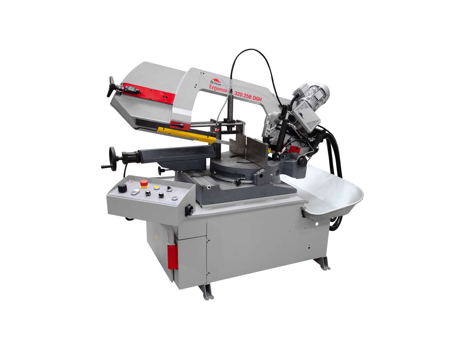 Universal halv-automatisk båndsav med en robust konstruktion, robust støbejernsarm og et 27 mm højt savbånd.