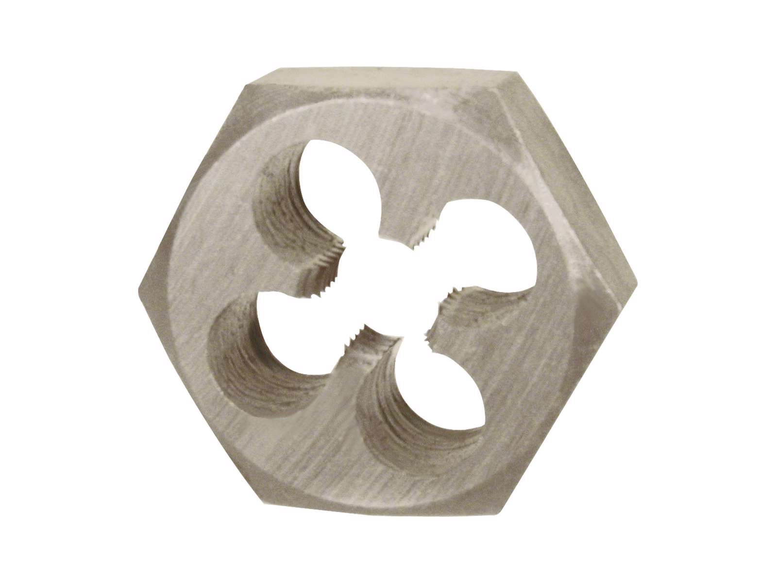 Den sekskantede massive skæremøtrik er fremstillet af højhastighedsstål (HSS) og er velegnet til bearbejdning af ulegeret og lavlegeret stål med en styrke op til 800 N/mm². Denne matrice skærer gevindet effektivt i én arbejdsgang, hvilket sikrer høj præcision og ydeevne.