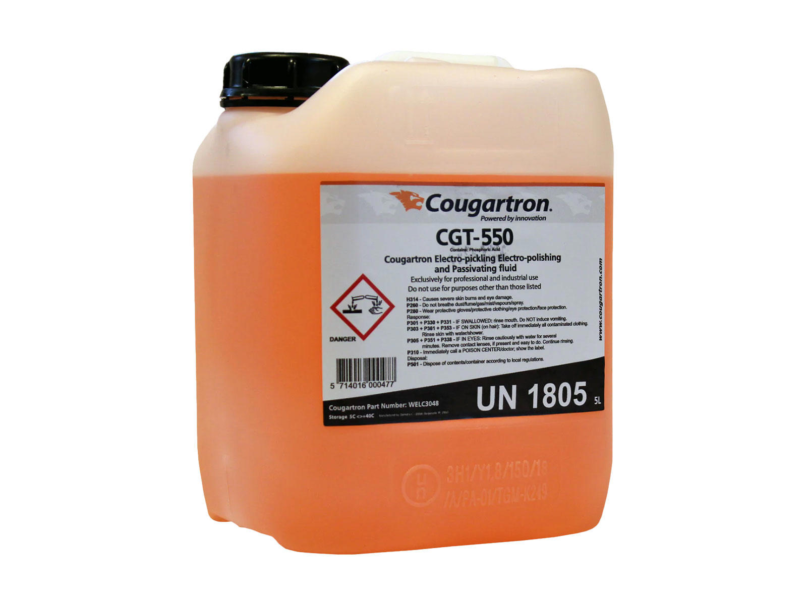 Cougartron CGT-550 bejdse og poleringsvæske anvendes til bejdsning, polering og passivering af svejsninger og overflader af rustfrit stål efter svejsning og fremstilling.