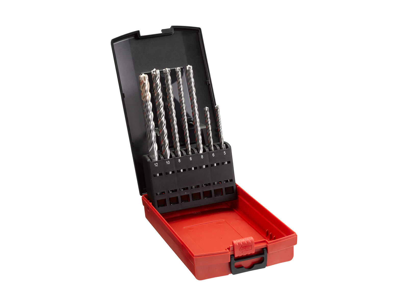 MX4-borene har symmetrisk 4-skærs geometri (4×90°) og skarp centreringsspids, som giver runde, præcise huller og stabil start – også ved kontakt med armeringsjern. Sættet dækker de mest brugte diametre fra 5–12 mm til montage og installation.