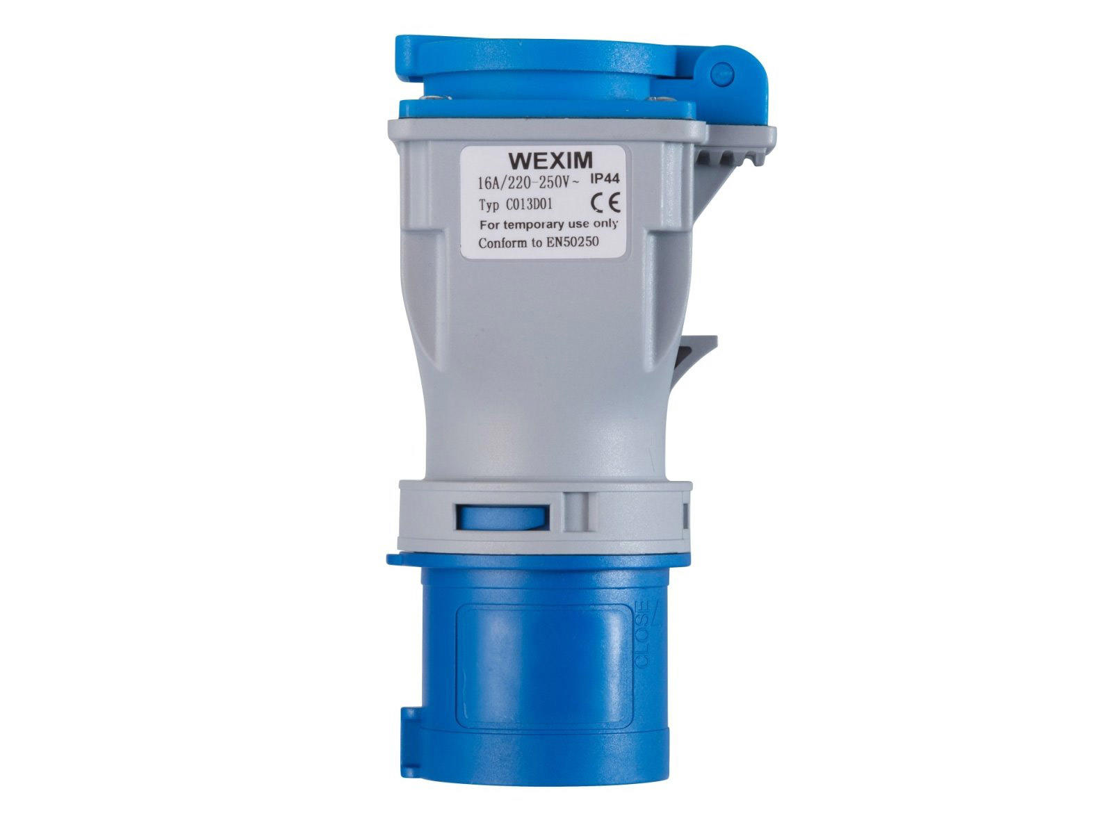 En adapter beregnet til at blive sat i en 230V/16A CEE-stikkontakt. Den anvendes, når der er behov for at tilslutte en dansk 230V-stikprop.