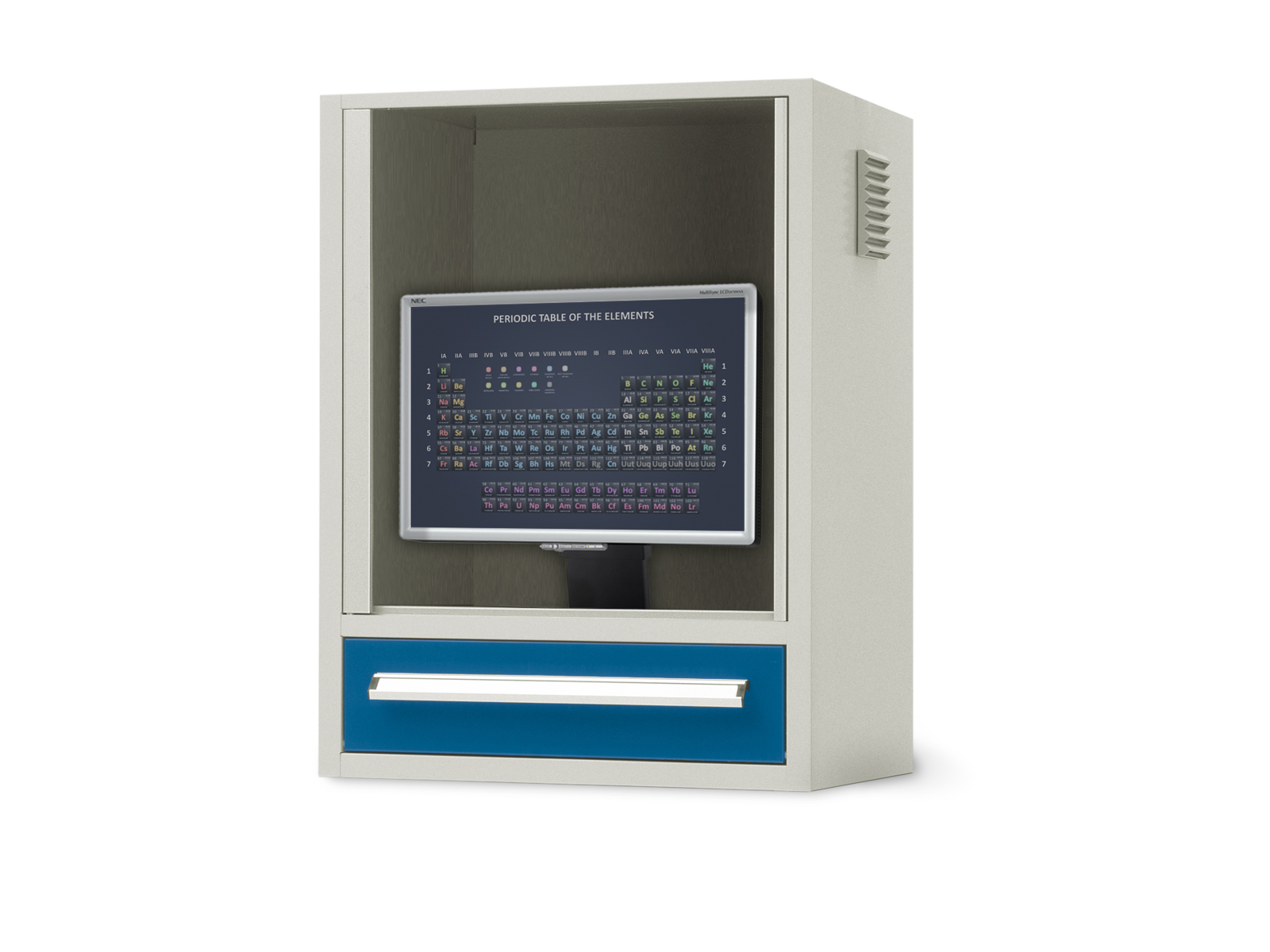 - Skærmskab: Udstyret med en klar låge i lexan, tilpasset til en 19" skærm.
