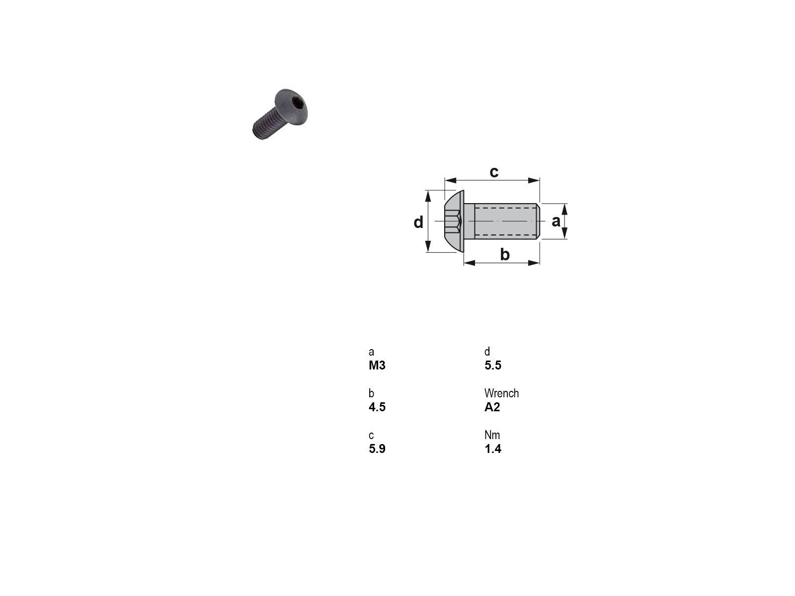 Canela skrue 1813 er en høj kvalitetsskrue, designet til at levere overlegen fastgørelse og holdbarhed. Den har en hoveddiameter på 5,5 mm, og den robuste konstruktion omfatter et M3x0,5 udvendig gevind. Med en totallængde på 5,9 mm og en gevindlængde på 4,5 mm er denne skrue ideel til præcisionsarbejde, hvor pålidelighed er nødvendig. Skruens 2 mm unbraco kærv sikrer nem og sikker montering.