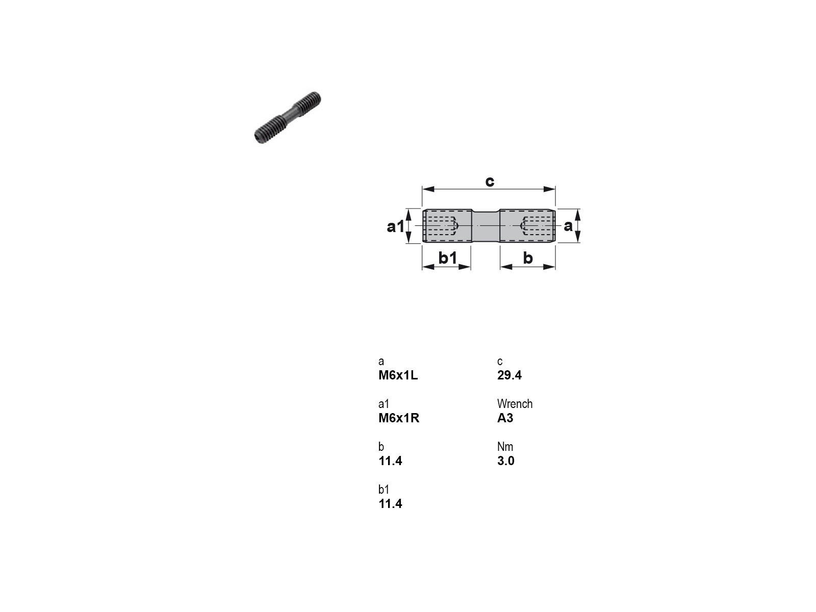Pinbolten har en totallængde på 29,4 mm og er forsynet med to gevindsektioner. Gevind 1 har specifikationerne M6x1 links og er 11,4 mm langt, hvilket er ideelt til venstrehåndede applikationer. Gevind 2 er også M6x1 og 11,4 mm langt, men højrehåndet, hvilket giver alsidighed og holdbarhed i mange forskellige sammenhænge.
