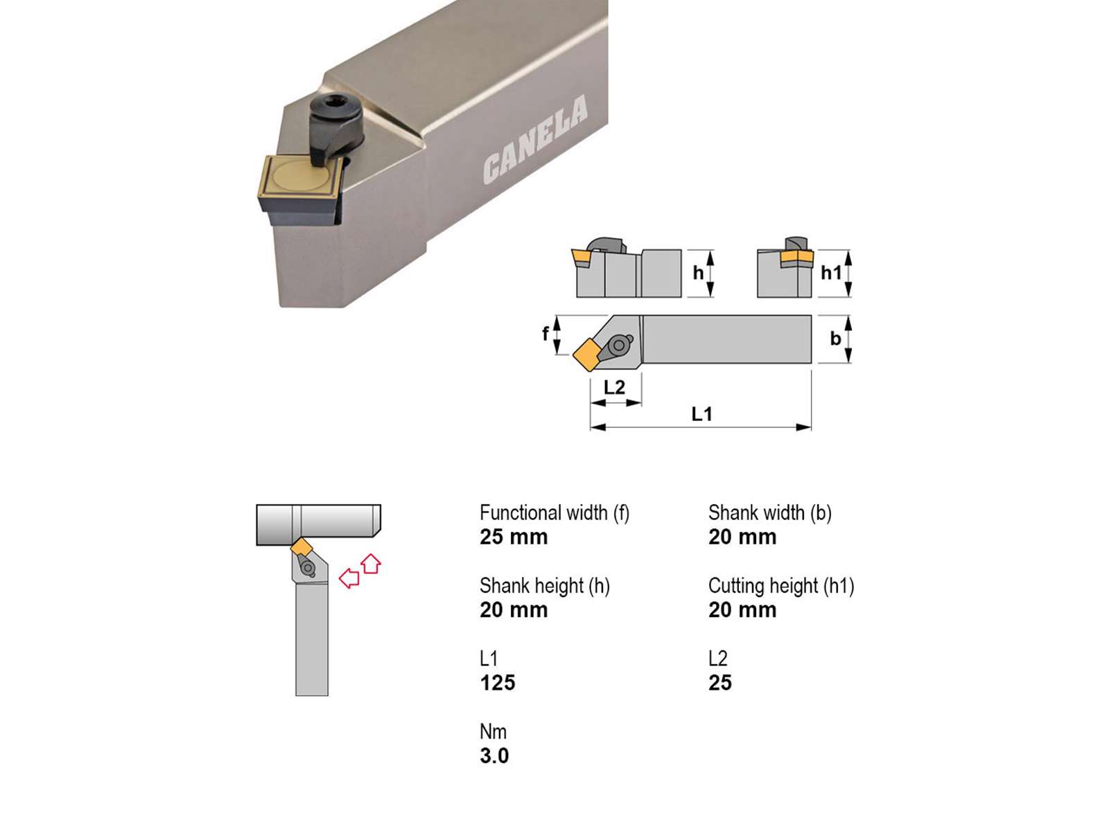 Canela CSSPR2020K12 er en robust stålholder designet til præcise bearbejdningsopgaver. Den er fremstillet af højstyrke-stål og sikrer optimal stabilitet under brug. Den egner sig ideelt til højreindgreb og anvender SP..1203.. platte for præcisionsskæring.