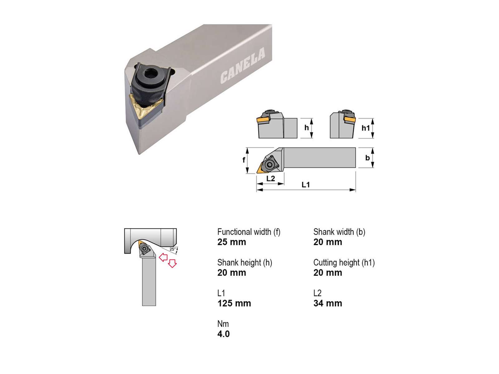 Canela stålholder MTJNR2020K16 er en robust og pålidelig drejeværktøjsholder designet til professionel bearbejdning. Med sit præcise design og kompatibilitet med TNM..1604..-platter sikrer den høj ydeevne og præcision i skæringen. Ideel til højrehånds indgreb.