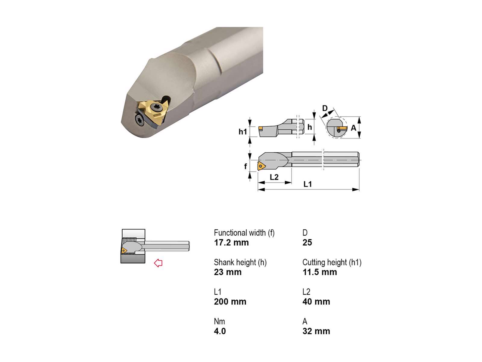 Canela S25R-STXNR22 gevindstål er et robust værktøj til præcis indvendig gevindskæring, kompatibelt med 22NR platte og højre indgreb.
