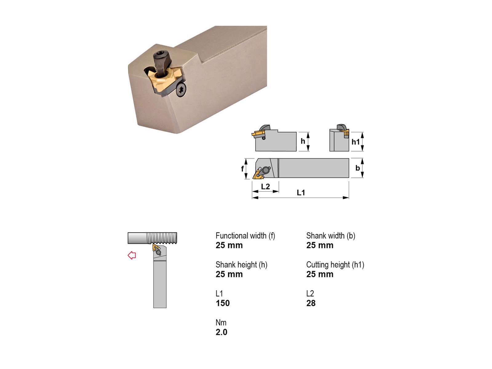 Canela CTANR2525M16 er en robust stålholder designet til præcis udvendig gevindskæring. Med sin kompakte 25x25 mm skaft og 16EL.. platte sikrer den præcist indgreb og pålidelig ydeevne. Perfekt til industrielle anvendelser uden køling.