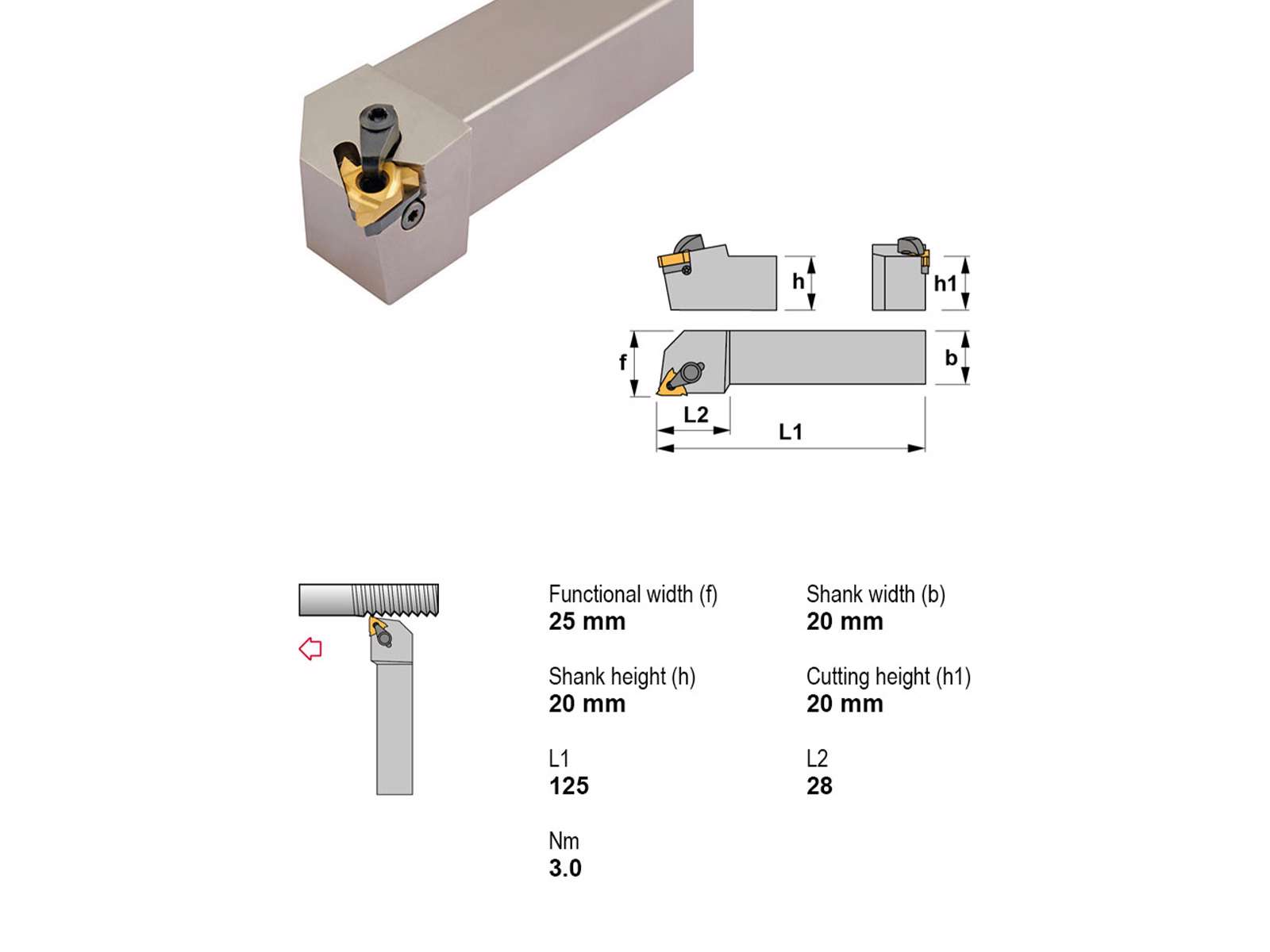 Canela CTXNR2020K16 stålholder er designet til præcis udvendig gevindskæring. Med en længde på 125 mm og et robust 20x20 mm skaft er denne holder ideel til højreindgreb og giver stabil ydeevne ved krævende opgaver. Den understøtter 16ER-platte og er uden køling, hvilket gør den perfekt til manuel skæring i tørre forhold.