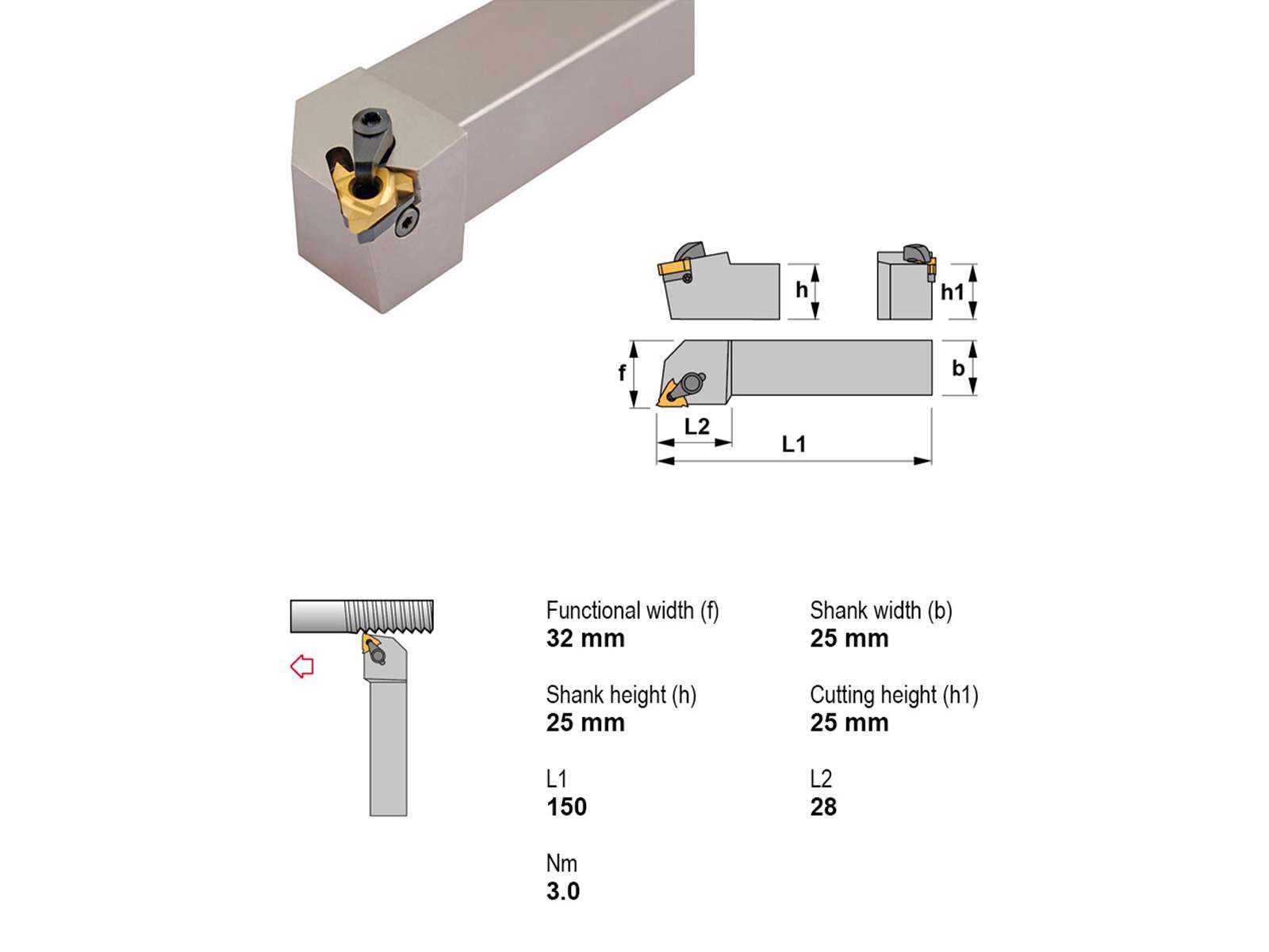 Canela stålholder CTXNR2525M16 er en robust og præcisionsfremstillet holder, designet til udvendig gevindskæring. Med sin højreindgreb og kompatibilitet til 16ER platte sikrer den effektiv bearbejdning uden køling. Fremstillet i høj kvalitet for at sikre stabilitet og lang levetid.