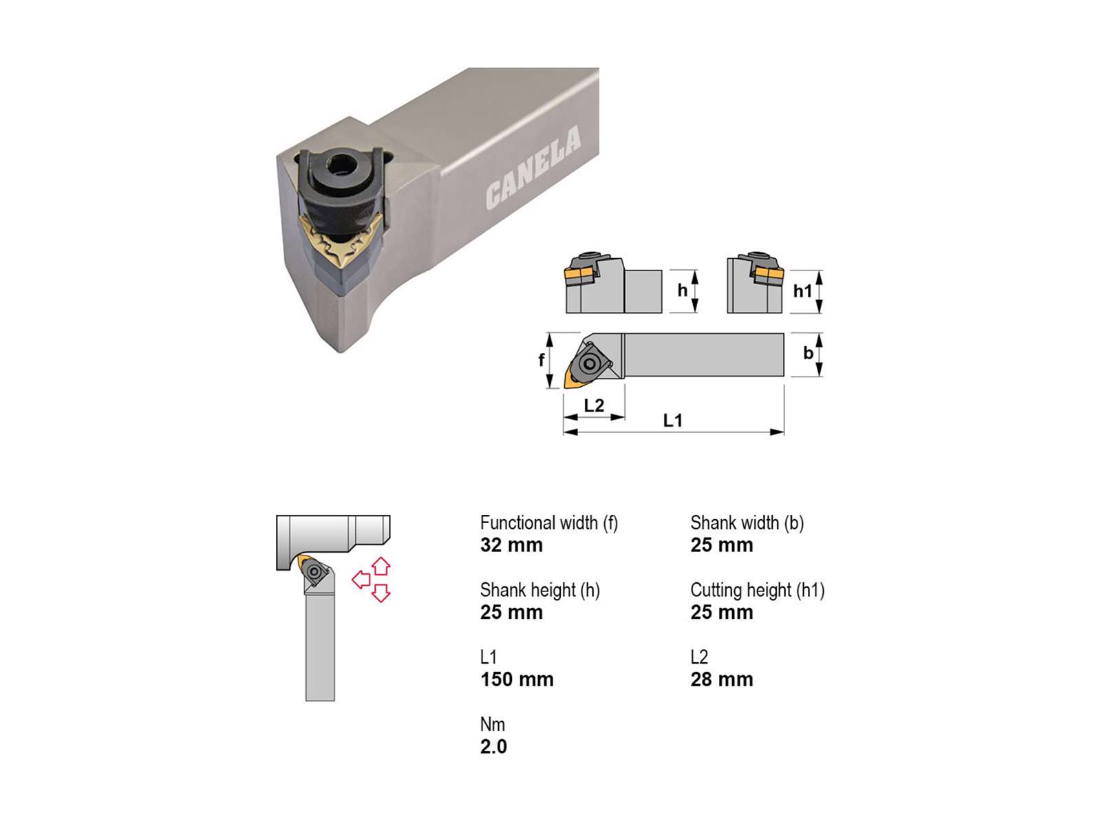 Canela stålholder MWLNR2525M06 er designet til præcisionsarbejde i metalbearbejdning. Med robust konstruktion og høj kompatibilitet er den ideel til professionelle operatører. Perfekt til WNMG0604-platter og højrehåndsindgreb.