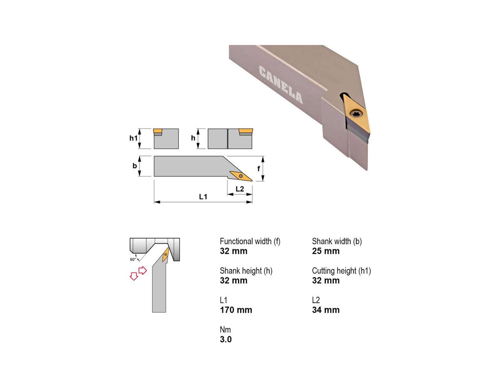 Canela SVJCL3225P16 er en robust stålholder konstrueret til præcise venstreskærende bearbejdningsopgaver. Med kompatibilitet til VCGT1604-platter og uden intern køling, er den velegnet til tør bearbejdning af metaller, hvor høj stabilitet og skarp skærekontrol er nødvendig.