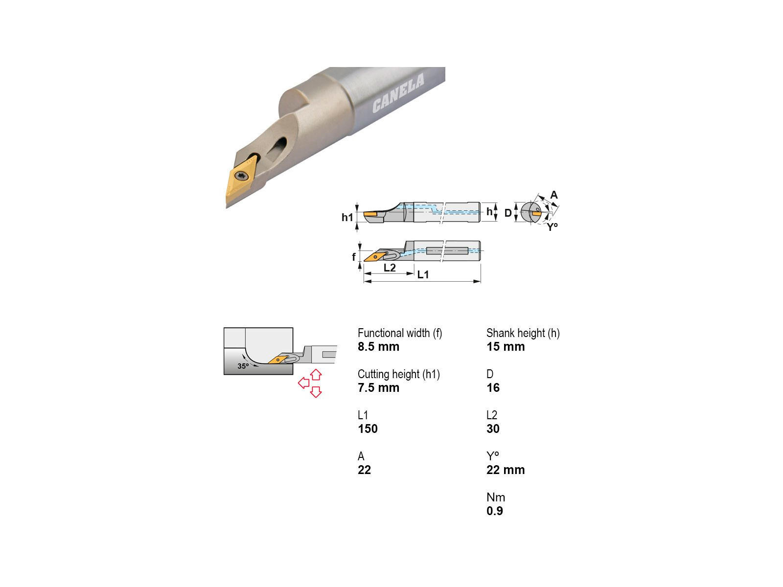 • Canela A16M-SVJCR11 udborestål er en højpræcisionsværktøj designet til effektiv bearbejdning af metal. Med en diameter på 20 mm og en indbygget kølekanal sikrer dette udborestål optimal køling under arbejdet. Det er velegnet til krævende skæreopgaver og kompatibelt med VC..1103.. plattetyper. Skaftet måler 15 mm, og udborestålet har en total længde på 150 mm, hvilket giver solid kontrol og præcision.