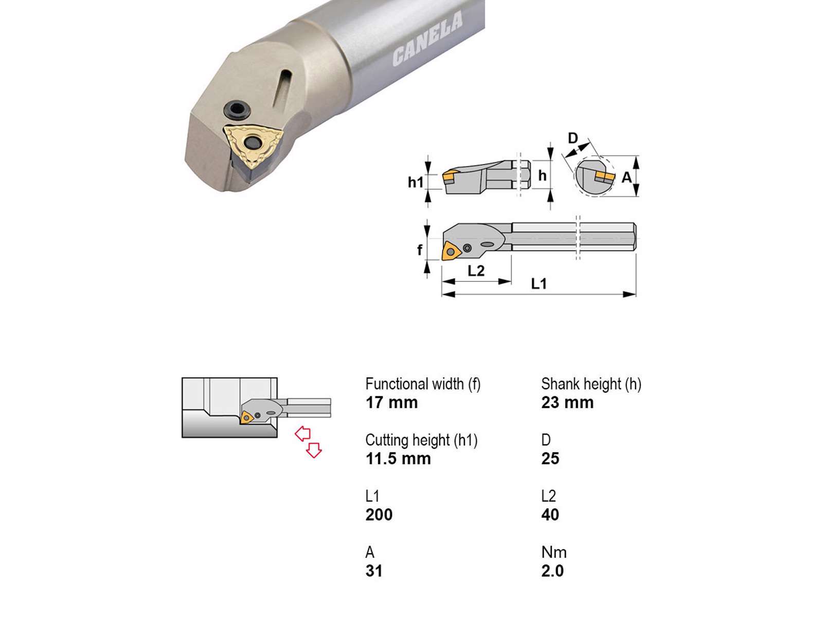 • Canela A25R-PWLNR08 er et robust udborestål designet til præcisionsopgaver. Med en skærediameter på 31 mm og en totallængde på 200 mm er den ideel til højreindgreb. Udborestålet er udstyret med en kølekanal, som sikrer optimal varmeafledning under bearbejdning. Det har en skaftdiameter på 23 mm og en hoveddiameter på 25 mm, hvilket gør det velegnet til anvendelse med SN..1204.. plattetyper.