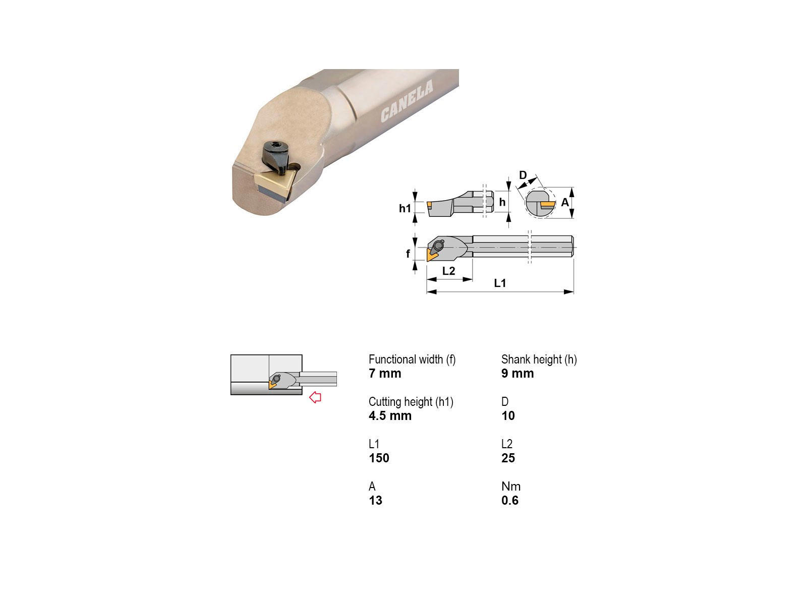 Canela udborestål S10M-CTFPR09 er et robust og præcist værktøj til udboring af metaller. Med en skaftdiameter på Ø10 mm og en skærediameter på 13 mm sikrer det præcise og effektive arbejdsprocesser. Velegnet til højrehåndsindgreb og kompatibel med TP..0902.. plattetyper.