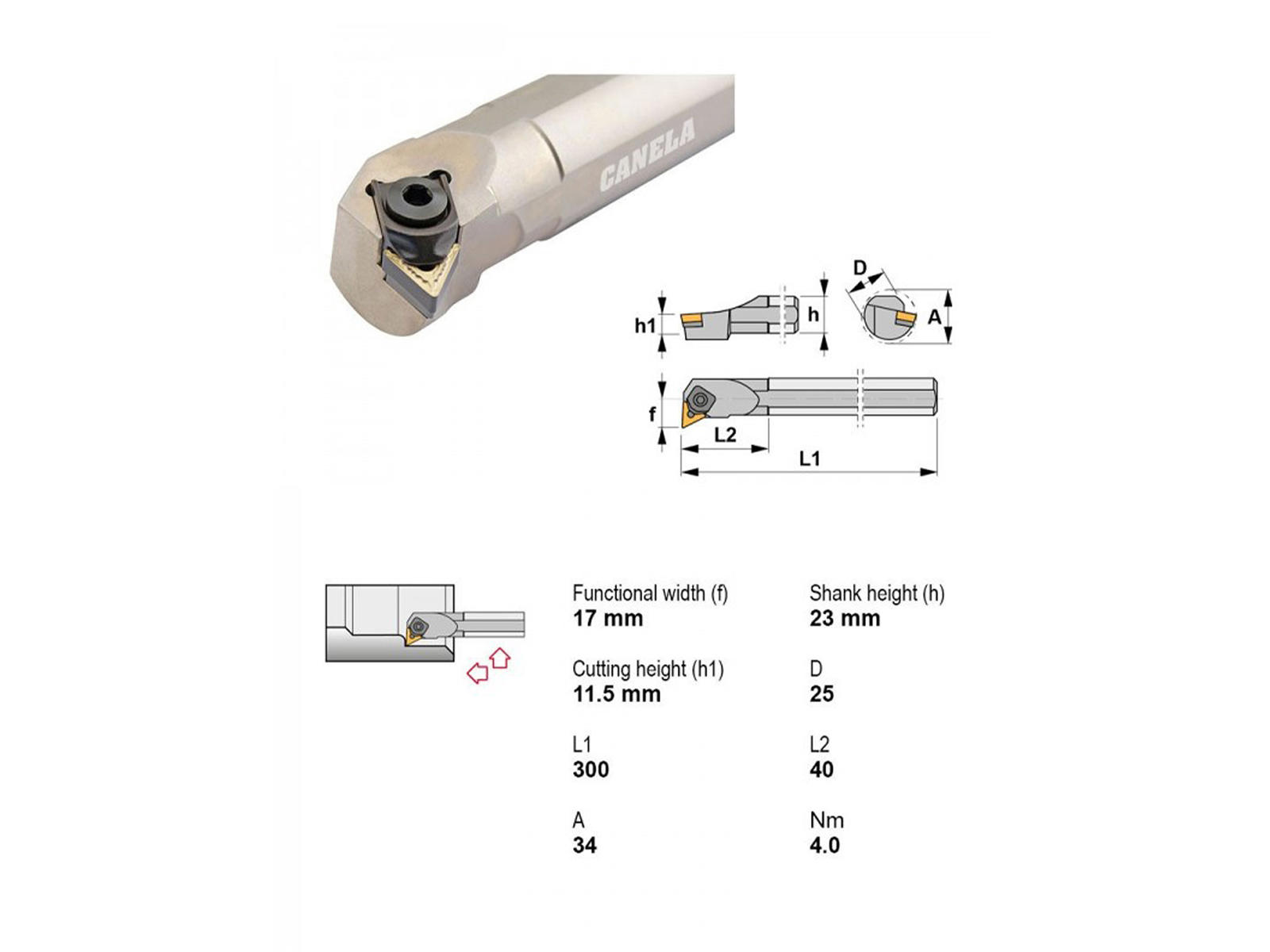 Canela S25T-MTUNR16 er et robust udborestål med Ø25 mm skaft og 300 mm længde, velegnet til krævende indvendig bearbejdning. Værktøjet er kompatibelt med TN..1604.. vendeskær og leverer præcise resultater uden køling.