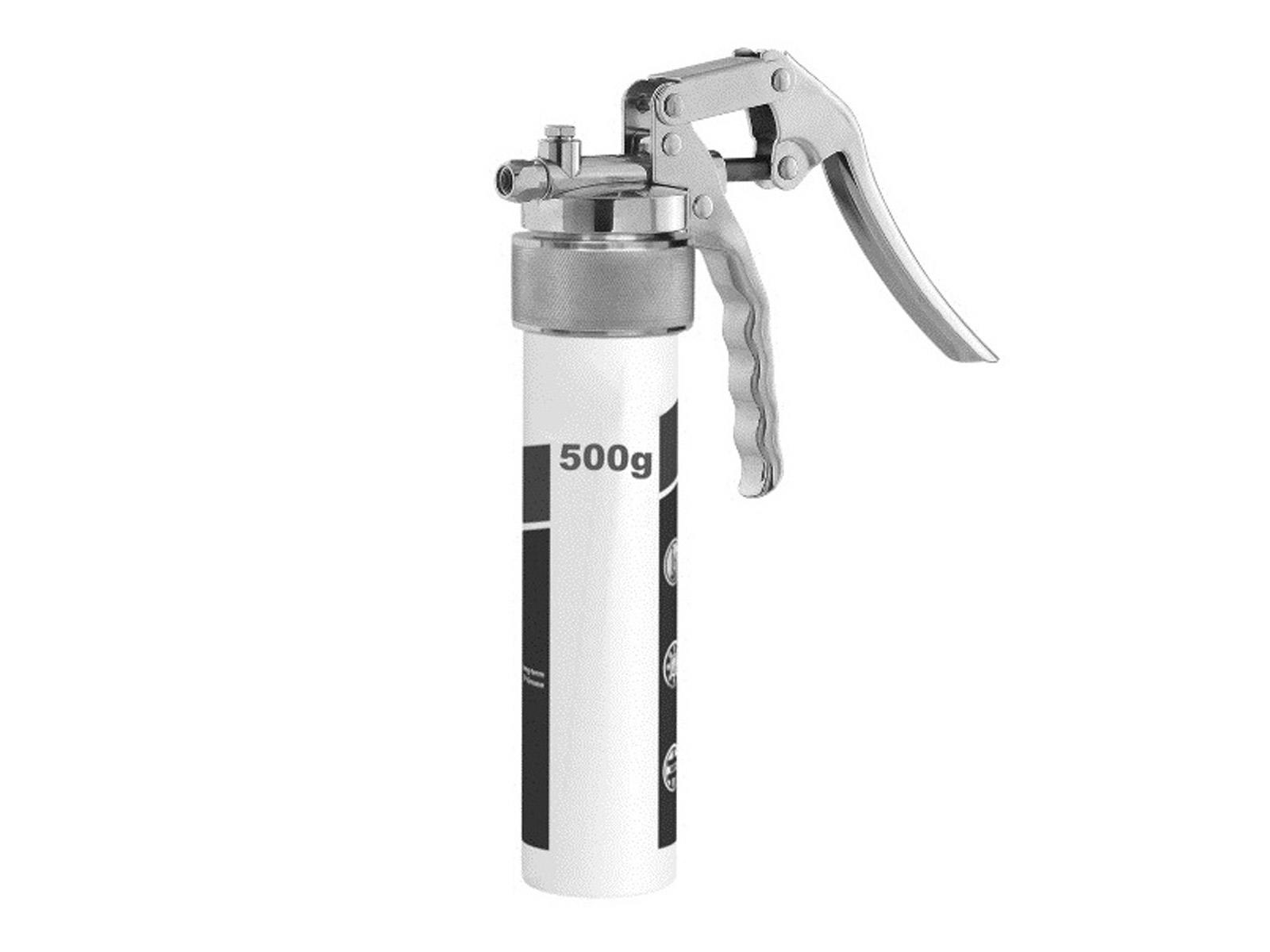 Enhånds-fedtpresser til 500 g patroner med forzinket stål-fedtbeholder og ergonomisk udformet håndtag. Tilslutningsgevind M10x1 eller R1/8". Trykstyrke på ca. 300 bar. Leveres i individuel emballage.