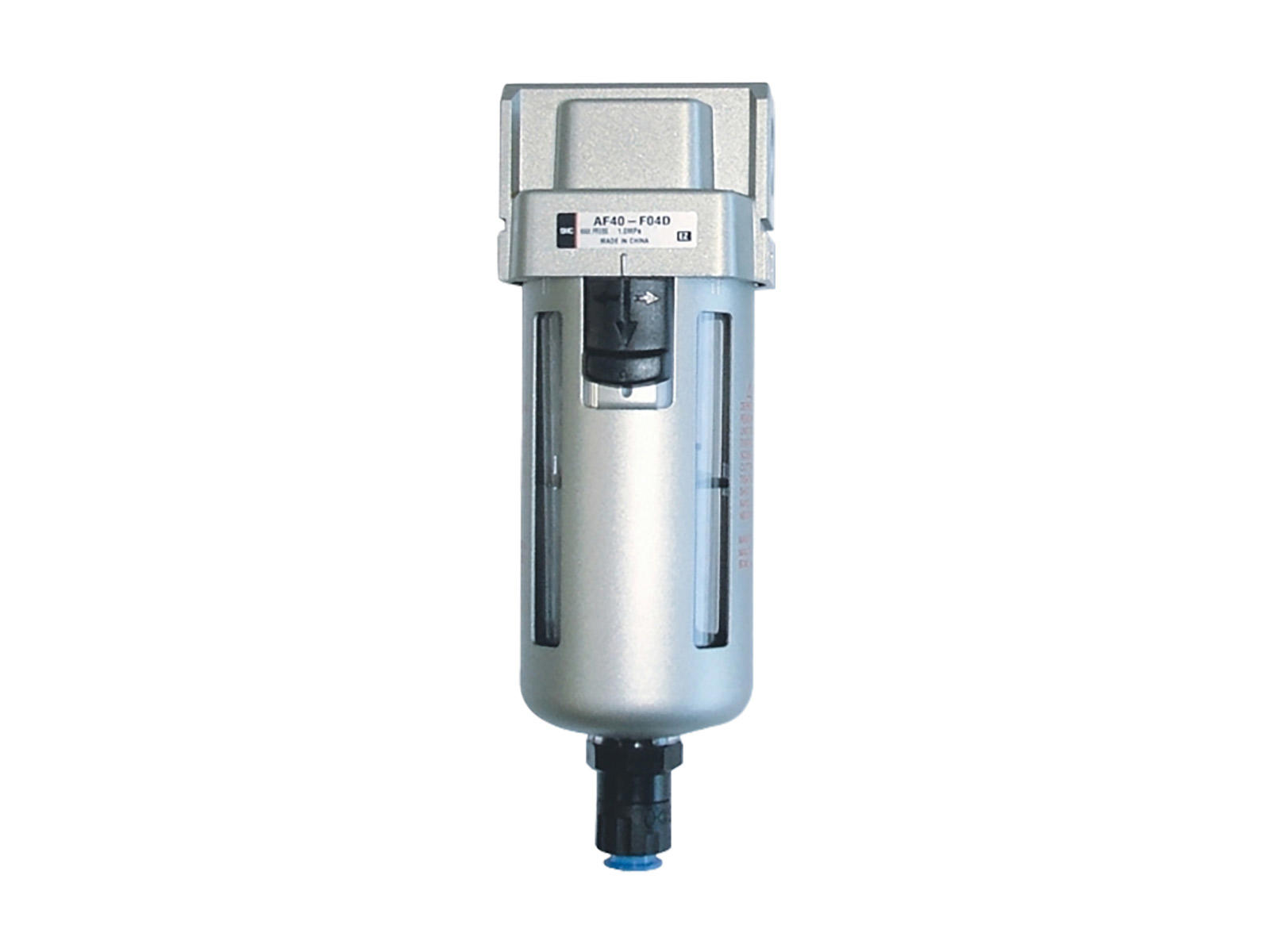 Luftfilter med porte i 3/8". Filterevne 5 µm. Automatsk dræn. Normally closed: Metalbeholder.