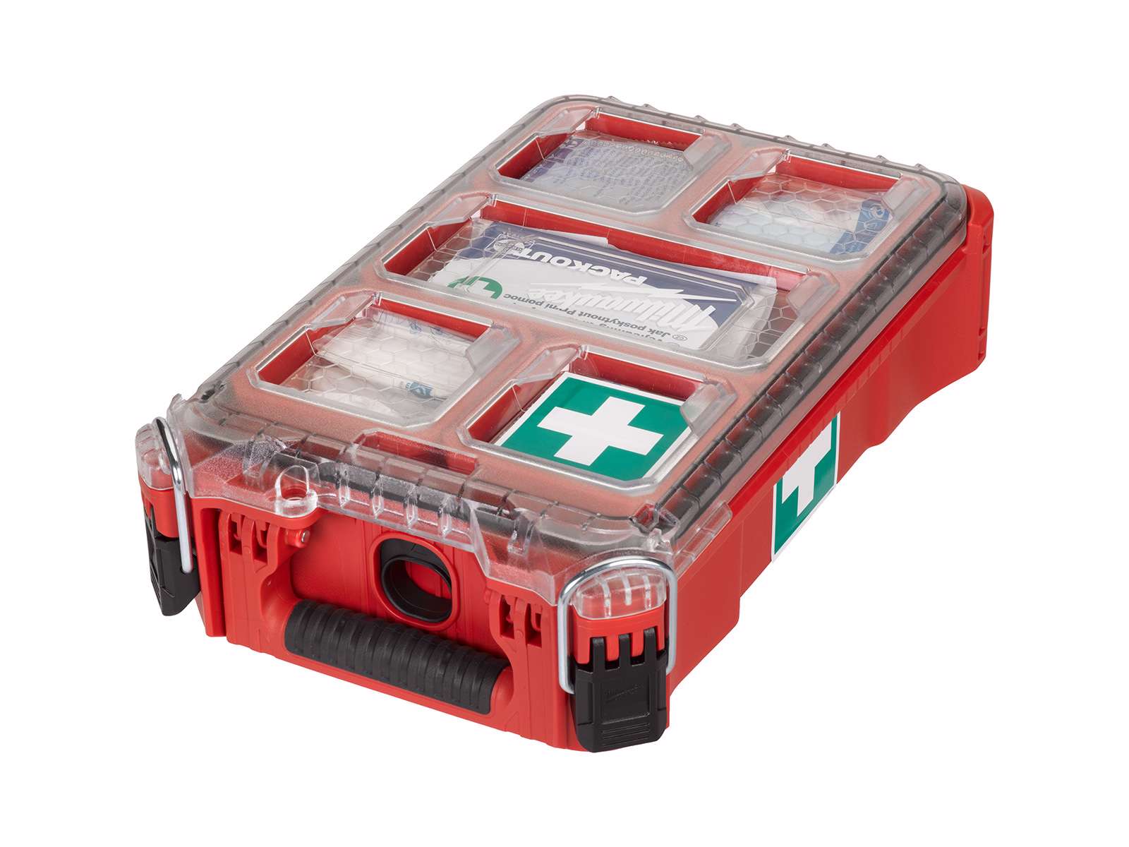 Milwaukee Packout Førstehjælpskasse er nøje designet til at imødekomme behovet for umiddelbar førstehjælp i udfordrende arbejdsmiljøer som byggepladser. Med dens karakteristiske rødfarvede PACKOUT kompakt tilbehørskuffert sikres hurtig identifikation i nødsituationer, hvilket er afgørende for rettidig intervention. Den er robust konstrueret i slagsfast polymerer, hvilket garanterer holdbarhed og langvarig præstation under krævende arbejdsbetingelser. Desuden er kassen udstyret med en IP65-klassificeret vejrforsegling, der effektivt forhindrer indtrængning af regn og snavs, hvilket er vitalt for at opretholde førstehjælpsudstyrets renhed og funktionalitet.