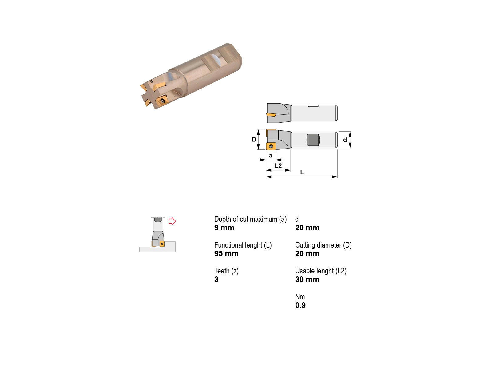 Canela endefræser 90° Ø20/20 er en højpræstationsværktøj, der er ideel til præcis og effektiv bearbejdning af materialer. Denne fræser har en skærediameter på 20 mm og en hovedlængde på 35 mm, og den er udstyret med 3 skær for forbedret skæreeffektivitet. Platten der kan anvendes med denne fræser er af typen AP..1003.