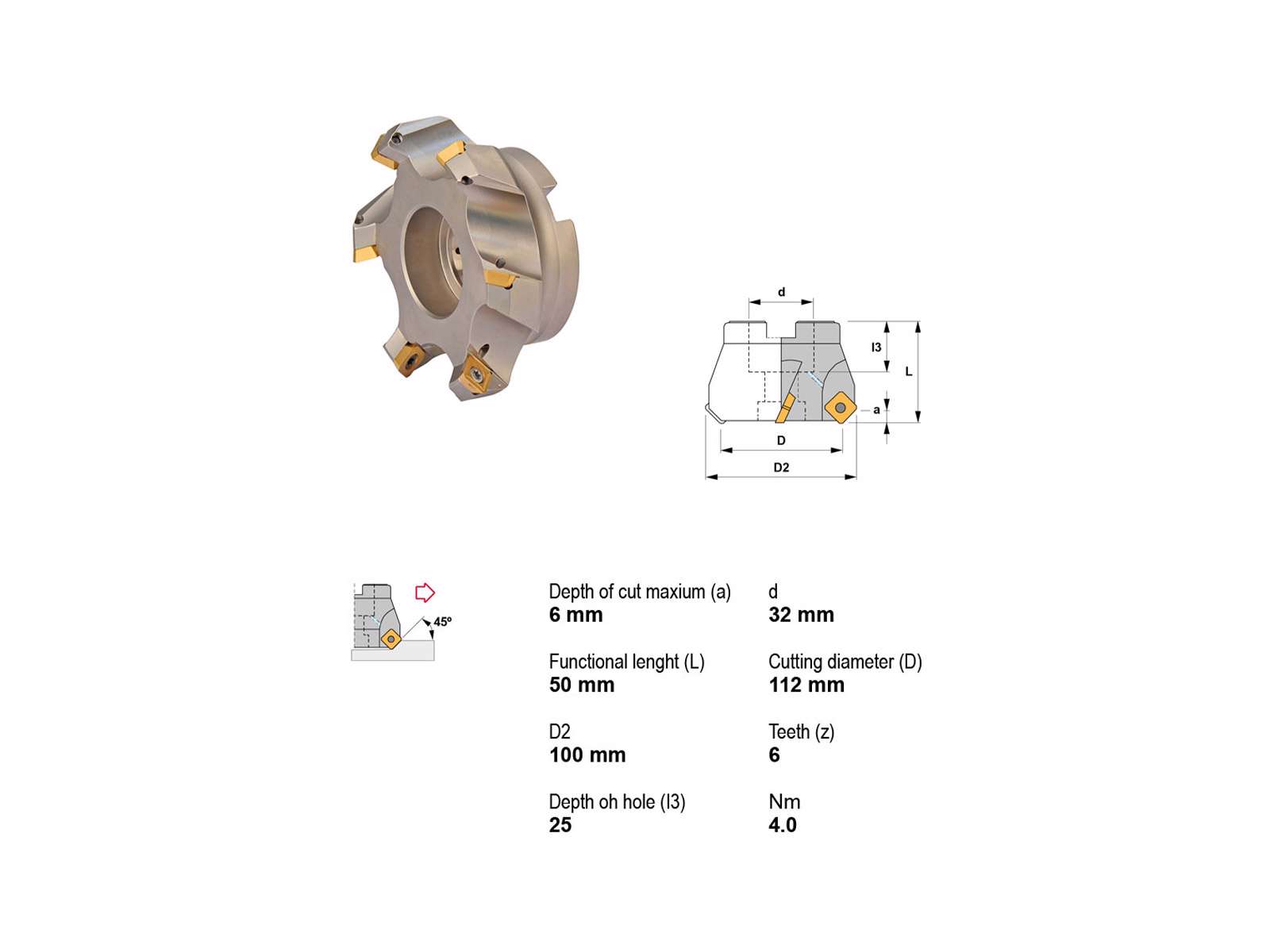 Canela Knivhoved. Dette robuste værktøj er designet til at håndtere krævende opgaver, takket være dens 45° skærevinkel og 6mm skæredybde. Med en 112mm hoveddiameter og 100mm skærediameter er dette knivhoved ideelt til detaljeret bearbejdning. Den integrerede køling forlænger værktøjets levetid og sikrer optimal ydeevne selv under intense arbejdsforhold. Kompatibelt med SE..1204 platter.