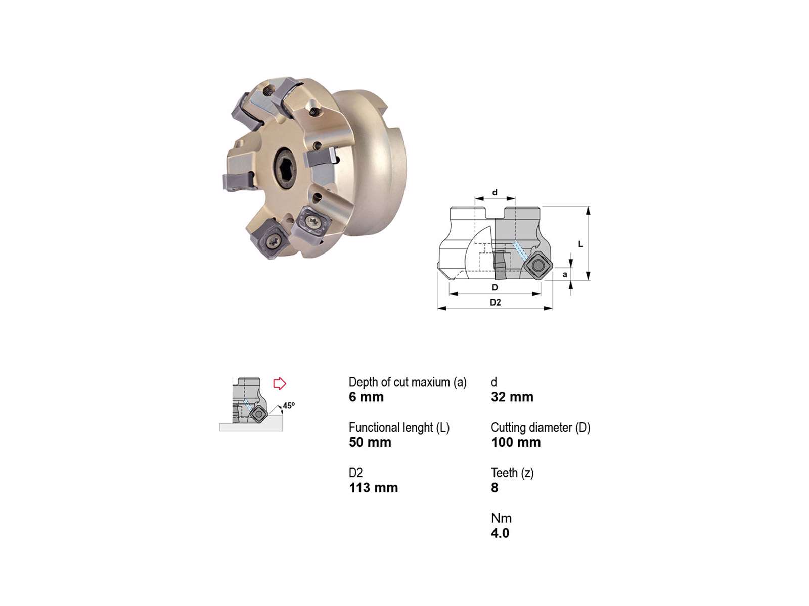 Canela Knivfræser, designet til præcision og holdbarhed. Med en 45° skærevinkel og 113 mm hoveddiameter tilbyder denne fræser optimal ydeevne for professionelle brugere. Dens kompakte design med 100 mm skærediameter og 6 mm skæredybde sikrer nøjagtige snit under alle arbejdsforhold. Fræseren har en Ø32 mm fæste og er udstyret med 8 robuste tænder, der garanterer lang levetid og minimal slid. Ideel til metalarbejde, hvor præcision er nødvendig.