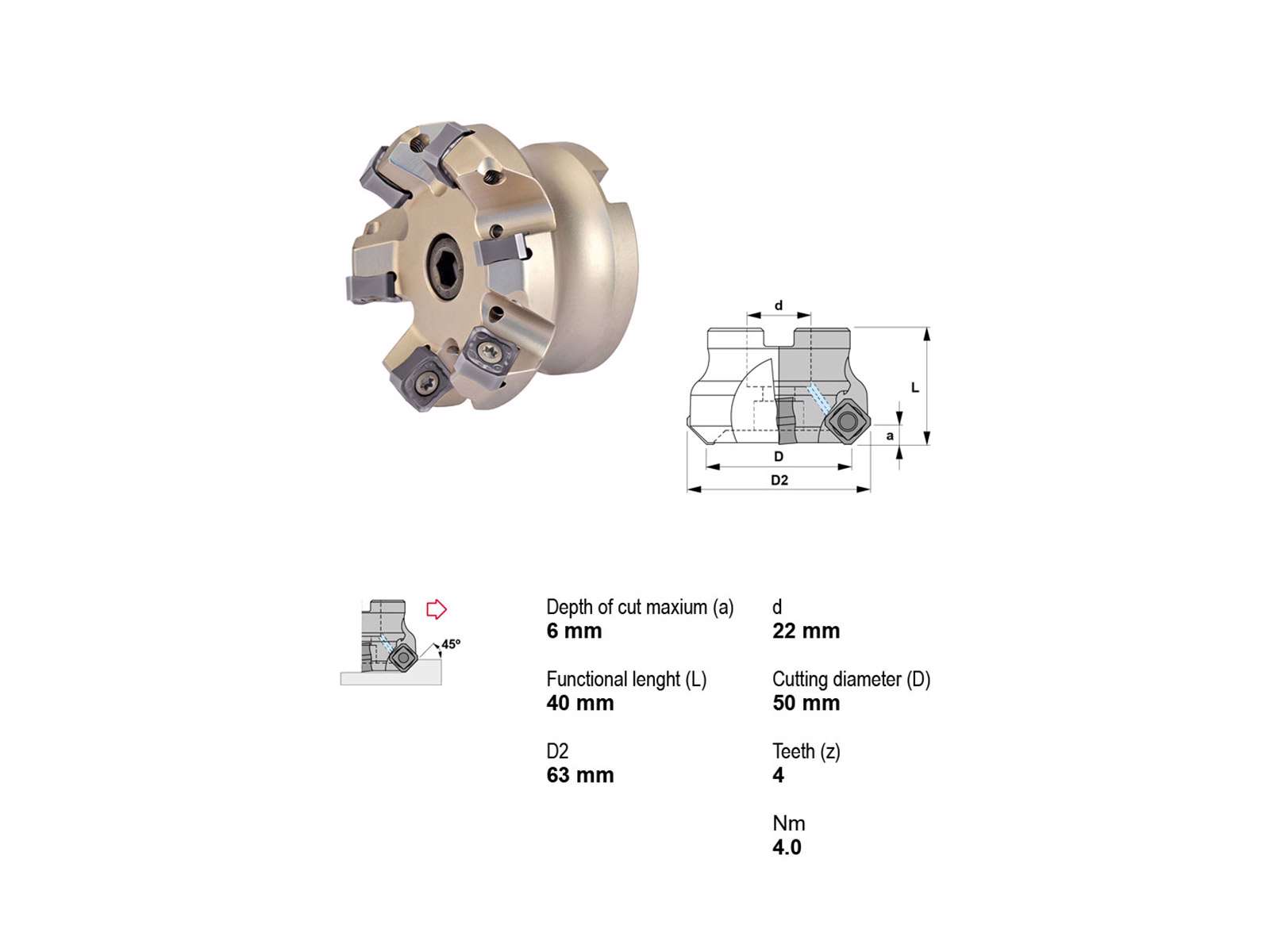 Canela Knivfræser er et professionelt værktøj, som er designet til at levere præcise og effektive snit i en bred vifte af materialer. Denne fræser er udstyret med en 45° skærevinkel, der sikrer skarpe og rene snit. Med en hoveddiameter på 63 mm og en skærediameter på 50 mm er denne knivfræser ideel til både grove og fint bearbejdende opgaver. Dens robuste design inkluderer fire tænder og er kompatibel med SNMX 1206.. platter, hvilket gør den velegnet til diverse maskinbearbejdninger, inklusive dem, der kræver køling.