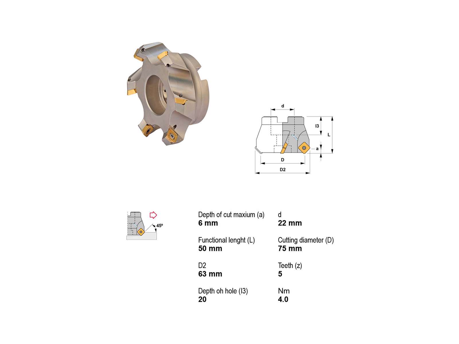 Canela Knivhovedet, designet til præcision og effektivitet. Dette robuste knivhoved har en 45° skærevinkel og 6 mm skæredybde, som sikrer nøjagtige og rene snit hver gang. Med en hoveddiameter på 75 mm og skærediameter på 63 mm er dette værktøj ideelt til både små og mellemstore projekter. Det er udstyret med et Ø22 mm fæste og har en længde på 50 mm, hvilket gør det kompatibelt med SE..1204 platter. Tilføjelse af køling forbedrer ydeevnen og forlænger værktøjets levetid.