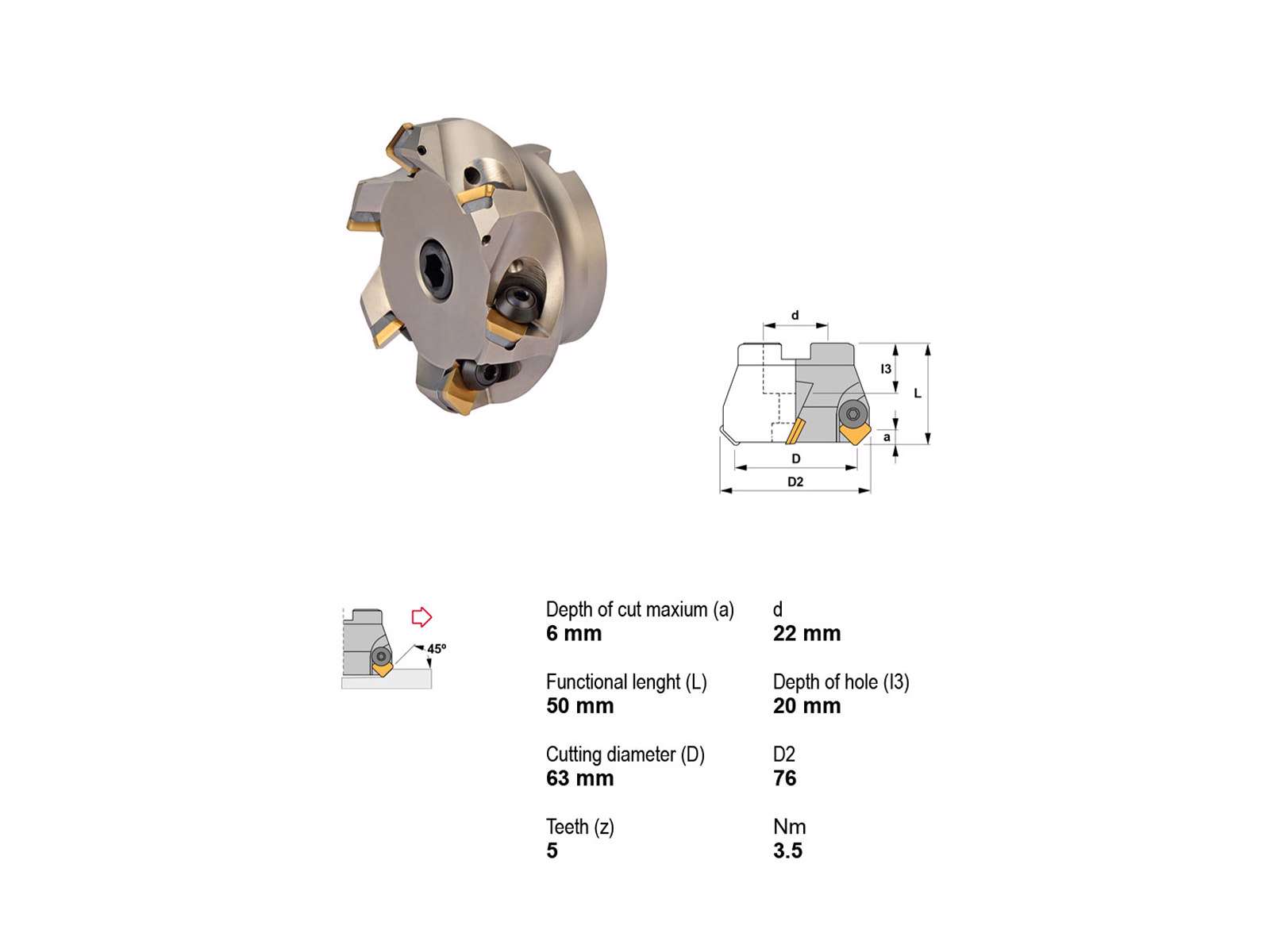 Canela knivhoved 45° Ø63/22 er ideelt til præcisionsopgaver i metalbearbejdning. Med en skærediameter på 63 mm og en total længde på 50 mm, tilbyder dette værktøj enestående ydeevne og nøjagtighed. Varen leveres med fire skær, der sikrer effektivitet og holdbarhed under brug.
