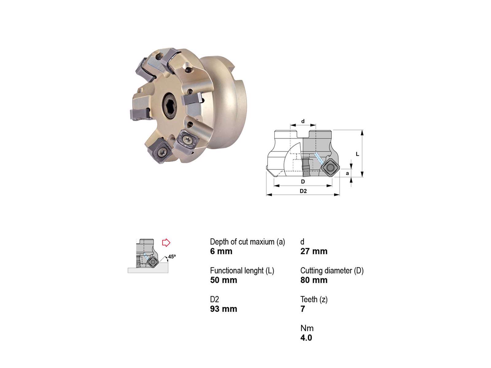 Canela Knivfræser er designet til præcision og holdbarhed. Med en skærevinkel på 45° og en skæredybde på 6 mm, tilbyder denne fræser fremragende ydeevne til en bred vifte af bearbejdningsopgaver. Den er udstyret med 7 skarpe tænder, ideel til både grove og fine fræsearbejder. Kølesystemet sikrer optimal driftstemperatur, hvilket forlænger værktøjets levetid og bevarer skærekvaliteten.'