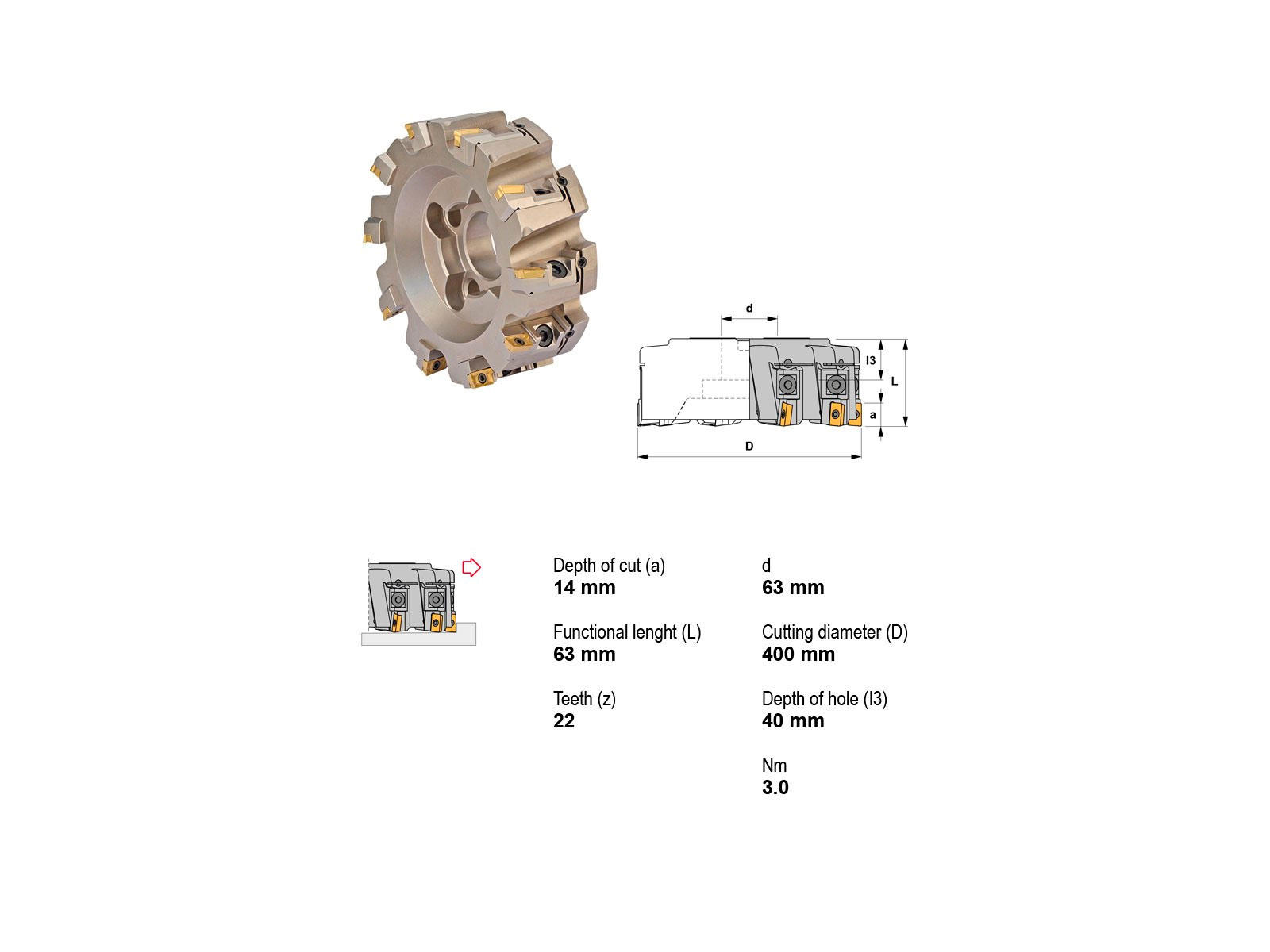 Canela 90° knivhoved er ideelt til præcisionsarbejde og specialopgaver. Dette værktøj har en imponerende 400 mm i hoveddiameter, der garanterer præcise og rene snit ved hvert brug. Designet med en robust 90° vinkel og 22 skarpe tænder, dette knivhoved sikrer optimal ydelse. Perfekt til professionel brug, kompatibelt med AP..16.. platter, og kræver ikke køling under drift.