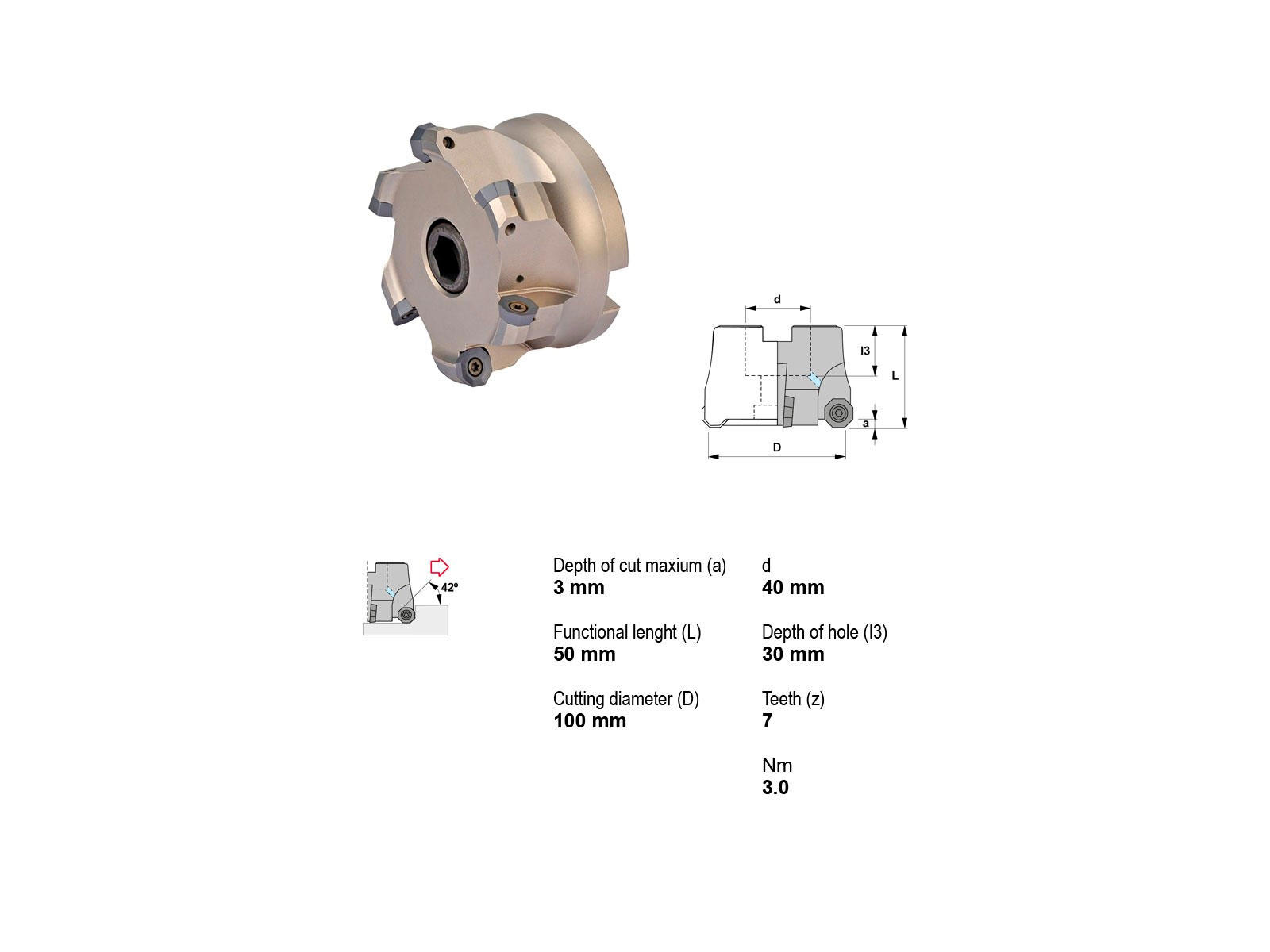Canela Knivhoved er et højkvalitets værktøj designet til præcis og effektiv skæring. Dette knivhoved har en imponerende skæredybde på 3 mm og en diameter på 100 mm, hvilket gør det ideelt til en række skæreopgaver. Med en fæstediameter på 40 mm og en længde på 50 mm tilbyder dette produkt robust konstruktion og holdbarhed. Dets syv skarpe tænder og kompatibilitet med ODMT 0404.. platter sikrer optimal ydeevne og køling under brug, hvilket gør det til et uundværligt værktøj i enhver værkstedsindstilling.