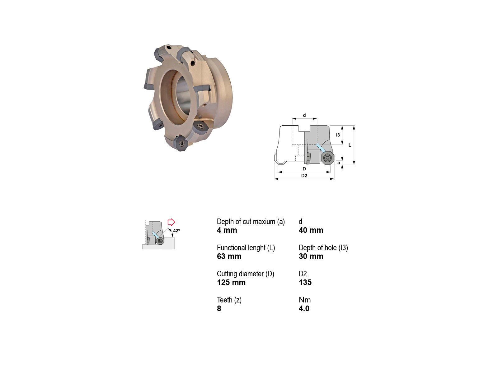 Canela Knivhoved er en præcisionsfremstillet komponent designet til avanceret skæreoperationer. Med en skæredybde på 4 mm og en skærediameter på 135 mm sikrer den effektiv og ren skæring. Den robuste konstruktion med et fæste på Ø40 mm og en samlet længde på 63 mm tilbyder høj holdbarhed og stabilitet under brug. Det er kompatibelt med ODM..0605.. platter, hvilket gør det alsidigt for forskellige maskintyper. Inkluderet kølesystem forlænger levetiden og forbedrer ydeevnen under drift.