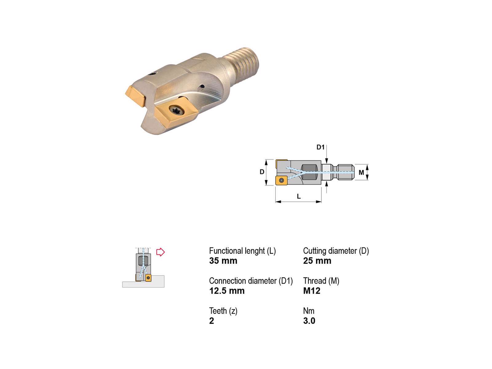 Canela endefræser 90° Ø25 er ideel til præcisionsarbejde med sin skærediameter på 25 mm og hovedlængde på 35 mm. Fræseren er udstyret med to skær og har en robust konstruktion med M12 gevind på skaftet, der sikrer stærk fastgørelse og stabilitet under brug. Denne model bruger platten AP..1604, hvilket gør den velegnet til forskellige fræseopgaver.