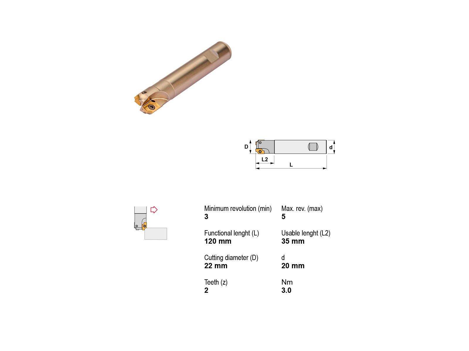 Canela Radiusfræser er ideel til præcisionsbearbejdning og tilbyder høj ydeevne med sin alsidige skæredybde på 3,0-5,0 mm. Denne fræser har en robust konstruktion med en hoveddiameter på 20 mm og en samlet længde på 120 mm, hvilket sikrer præcision og holdbarhed under brug. Uden behov for køling, er denne fræser perfekt til tørfræsning og kan anvendes med ADMT 1503 platter, hvilket øger dens alsidighed og effektivitet.