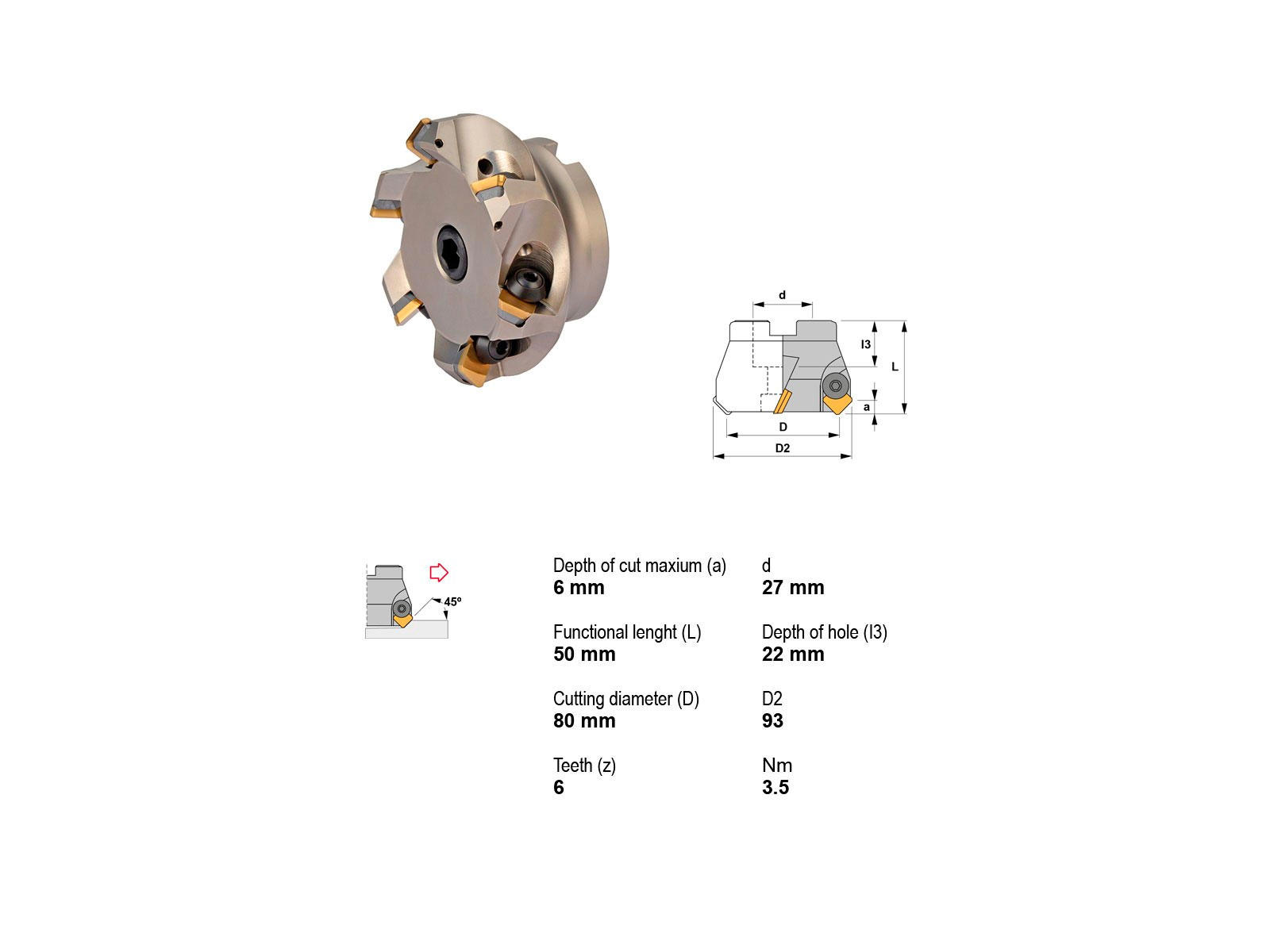 Dette præcisionsknivhoved fra Canela er designet til optimal ydeevne med en 45° vinkel og en skærediameter på 80-93 mm. Udstyret med 6 skær og anvender platte SEK 1203 for pålidelig bearbejdning. Det robuste design sikrer en hovedlængde og en total længde på 50 mm hver. Dette værktøj er velegnet til opgaver, der kræver præcision uden brug af køling.