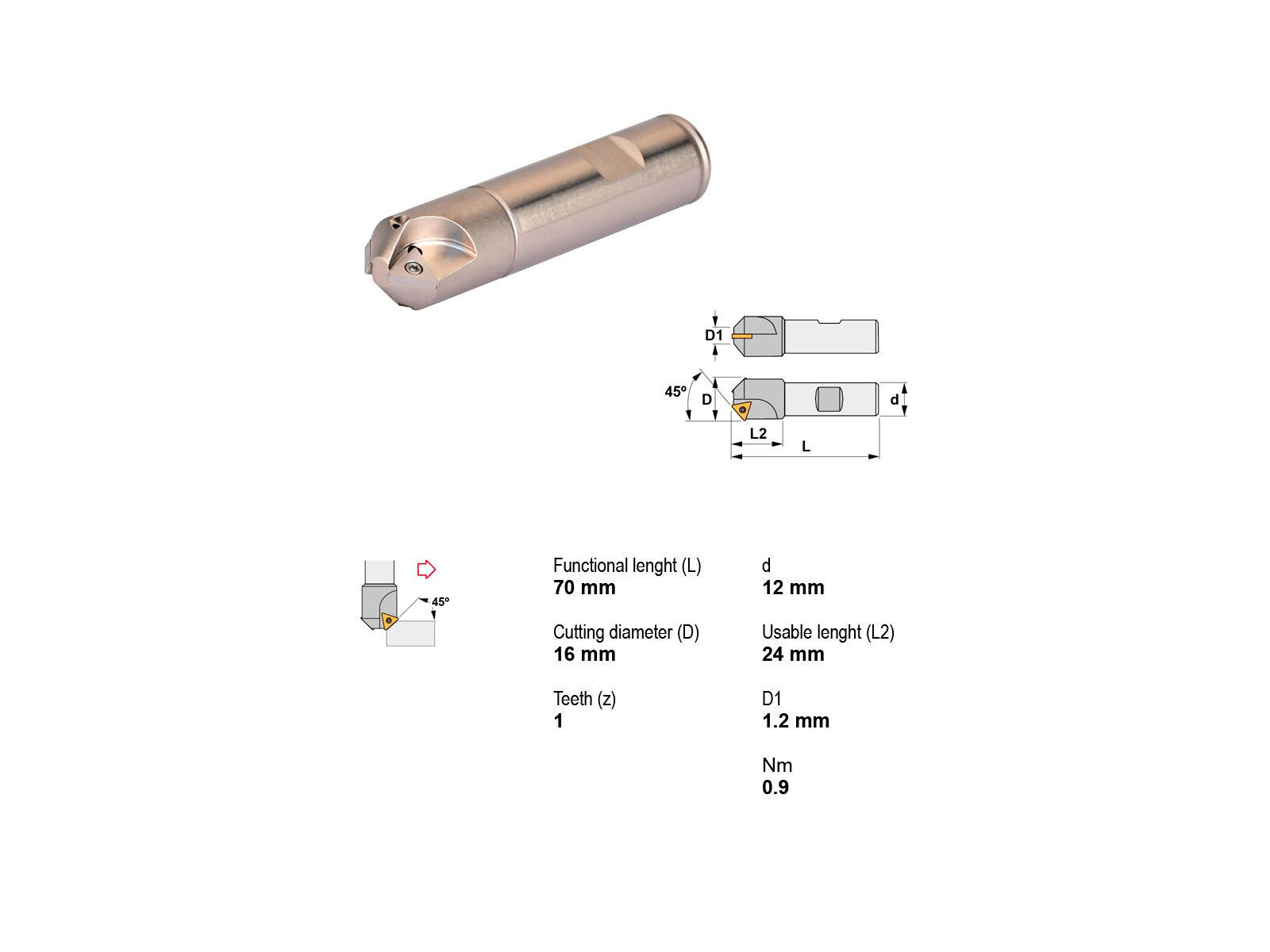 Canela knivhoved 45° Ø16/12 er et præcisionsværktøj designet til detaljeret og præcist skærearbejde. Dette knivhoved har en skærediameter på 16 mm og en kompakt hovedlængde på 24 mm, hvilket giver optimal kontrol under brug. Den samlede længde på 70 mm gør den ideel til brug i mindre rum. Perfekt til professionelle håndværkere og industrielle applikationer.