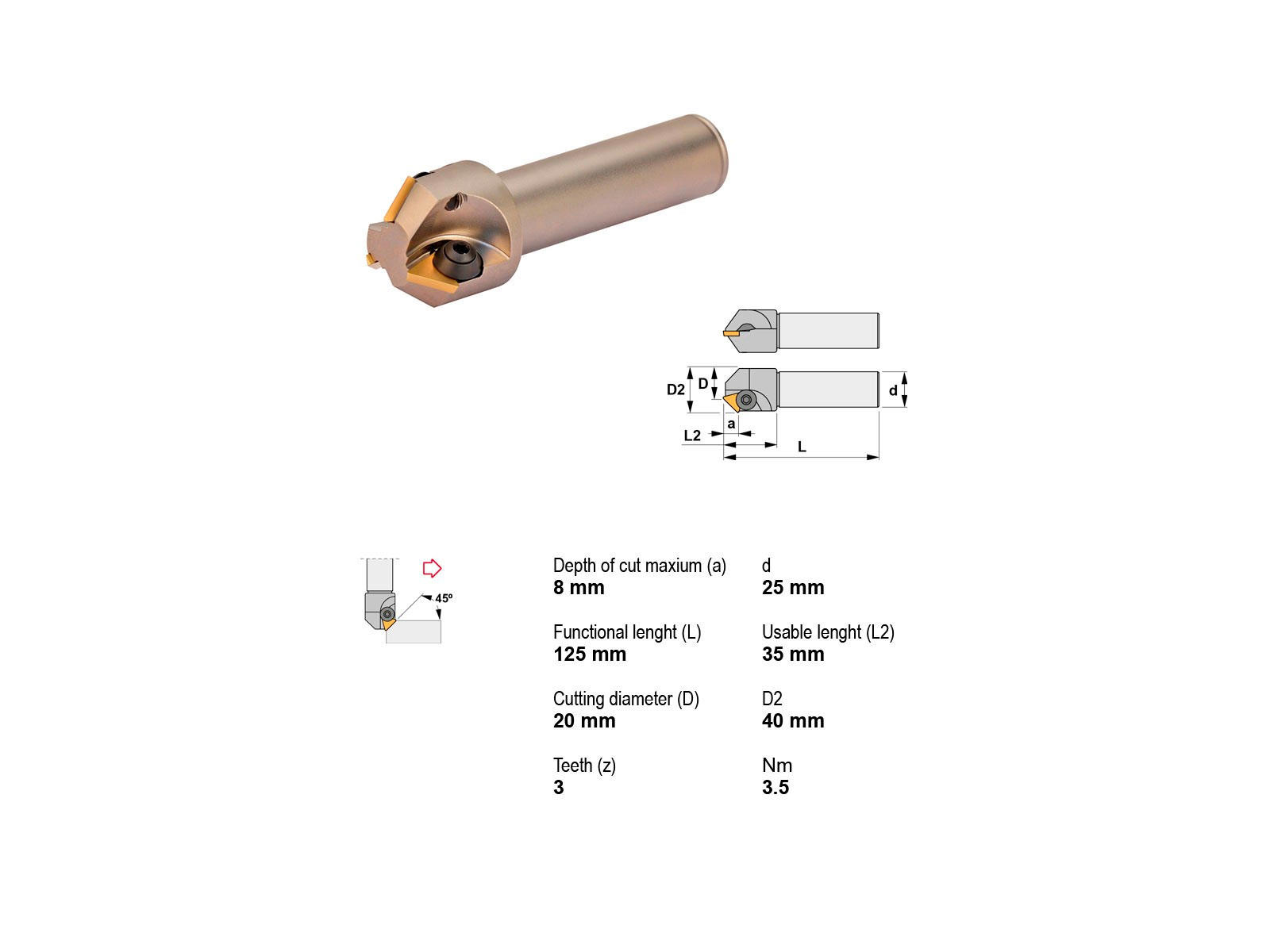 Dette robuste Canela knivhoved er designet med en 45° vinkel for optimal skæreeffektivitet. Med en skærediameter på 40 mm og en hovedlængde på 35 mm, tilbyder denne enhed præcise og rene snit. Den understøtter en maksimal skæredybde på 8 mm og er anvendelig uden køling, hvilket gør den ideel til forskellige bearbejdningsopgaver.