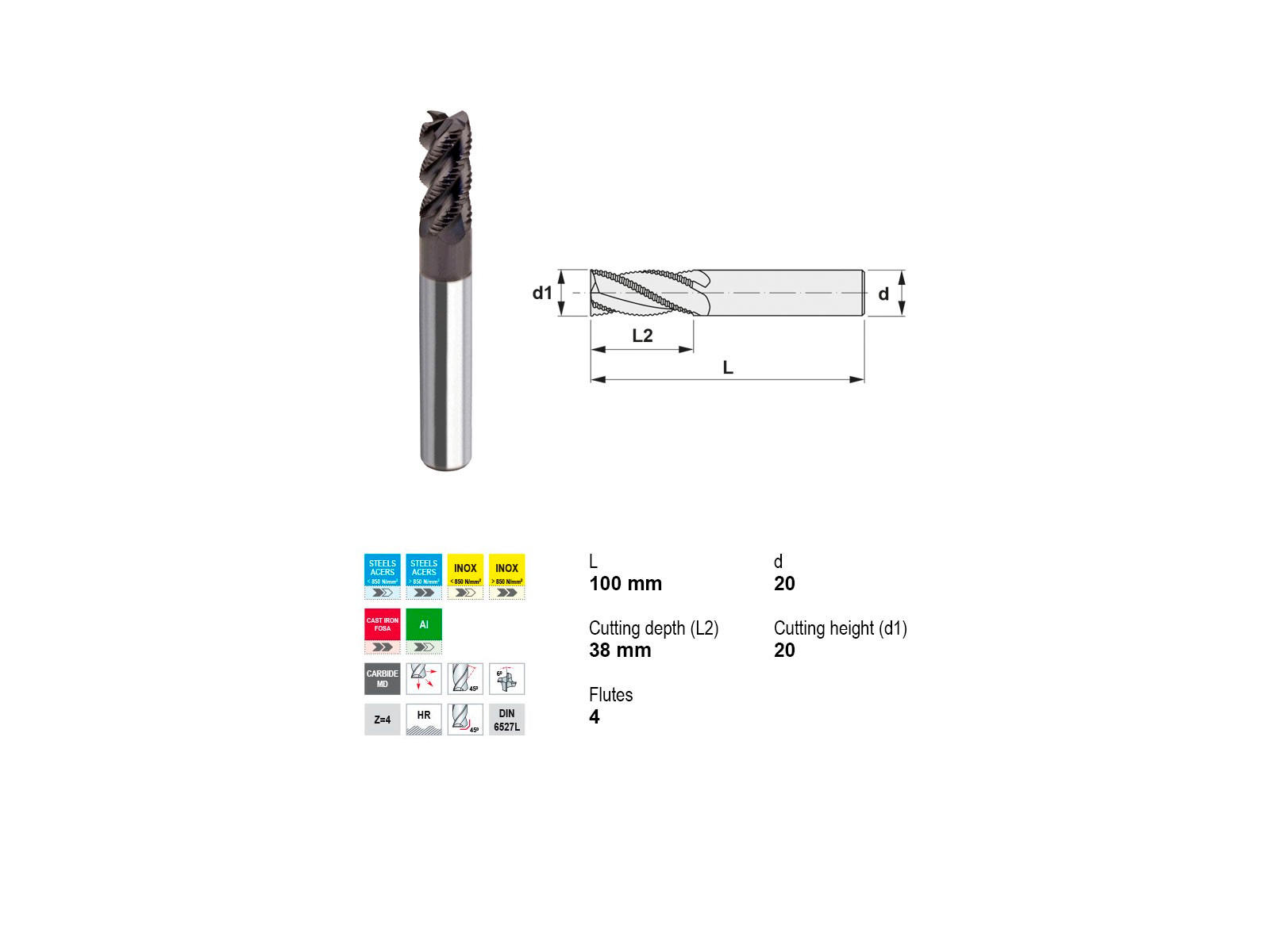 Canela HM skrubfræseren med 4 skær er en ideel løsning for professionel bearbejdning af forskellige metaller. Dette robuste værktøj med et skaft på Ø20 mm og en hoveddiameter på 20 mm sikrer præcis og effektiv fræsning. Med en skæredybde på 38 mm og en totallængde på 100 mm, tilbyder denne fræser stor alsidighed og høj ydeevne, selv uden kølesystem. Den er specielt designet til at håndtere både bløde og hårde metaller, herunder forskellige typer stål og inox, såvel som aluminium og støbejern.