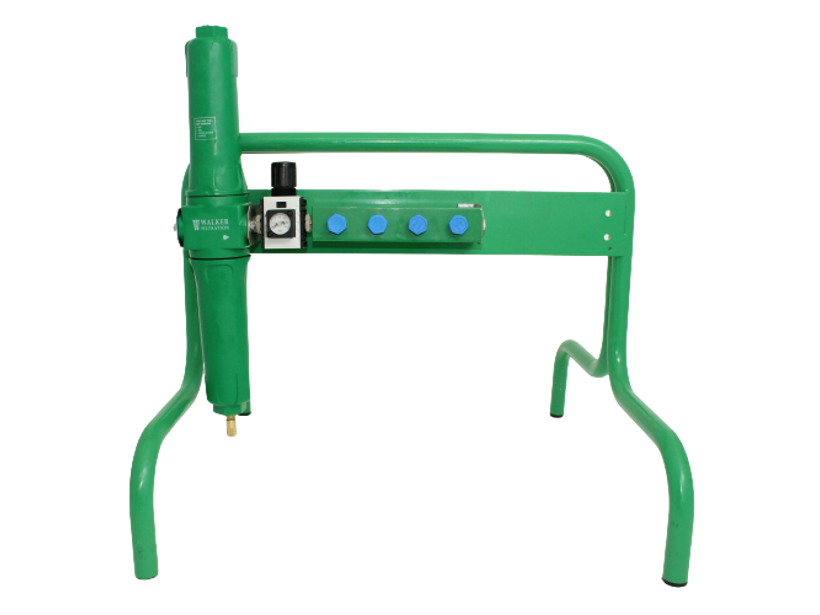 Komplet på gulvstativ, manometer, reduktionsventil,kulfilter, olie-vandudskiller & manifold med 4 udtag.