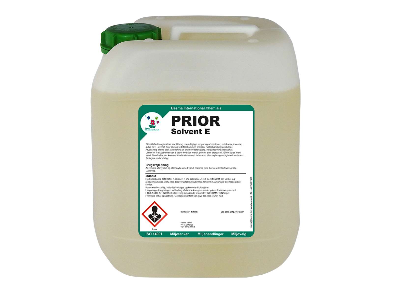 Prior Solvent E er en effektiv motorrens og koldaffedter, der kan anvendes på maskiner, værktøj og overflader med olie-, fedt- og voksforurening. Produktet er designet til at opløse selv krævende stoffer såsom bitumen og harpiks, og kan anvendes ufortyndet med mulighed for efterfølgende skylning med vand.