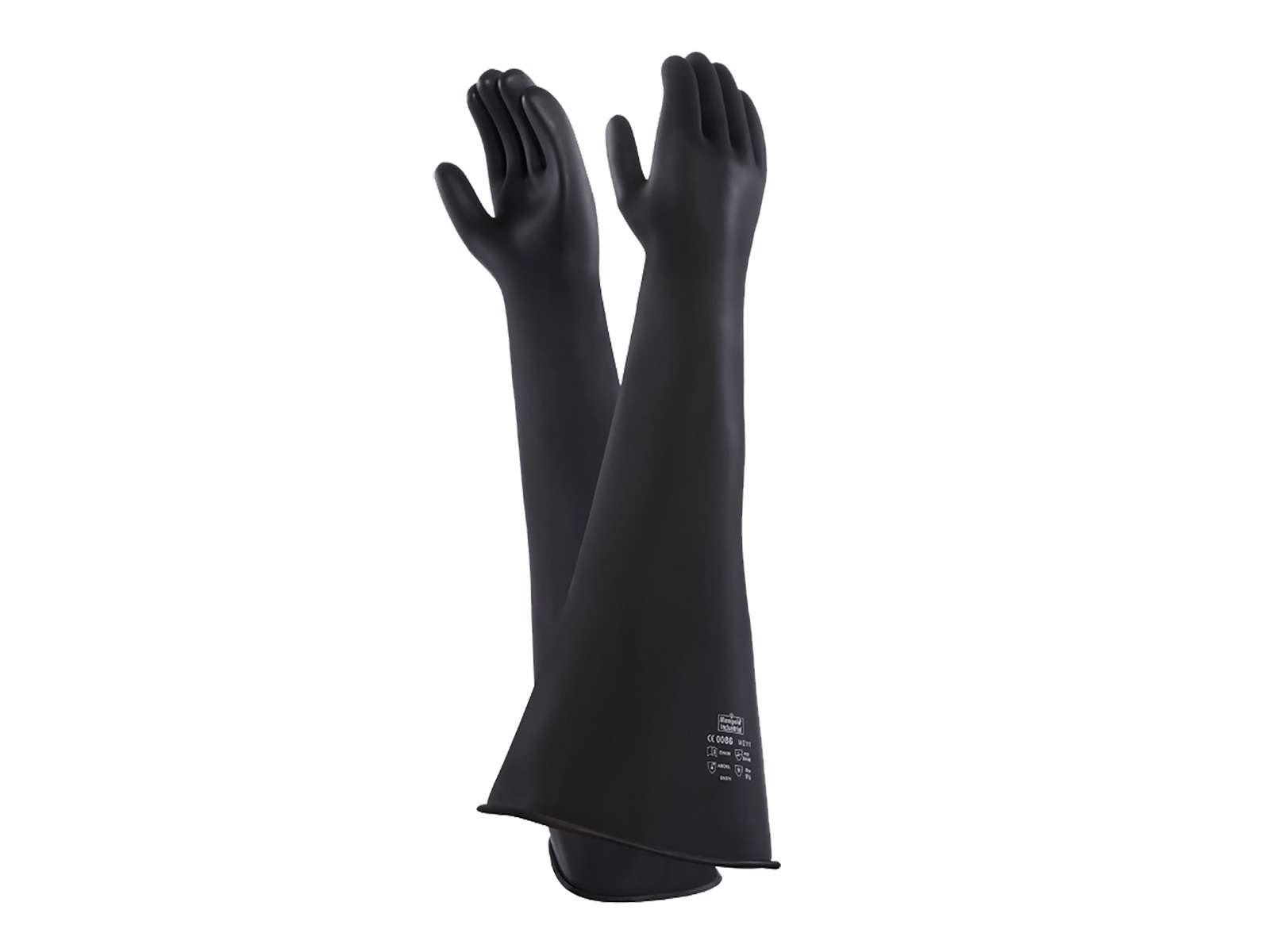 Gummihandsker sort 61 cm str. 10–12 er lange beskyttelseshandsker beregnet til arbejde, hvor der stilles krav til øget dækning af hånd og underarm.