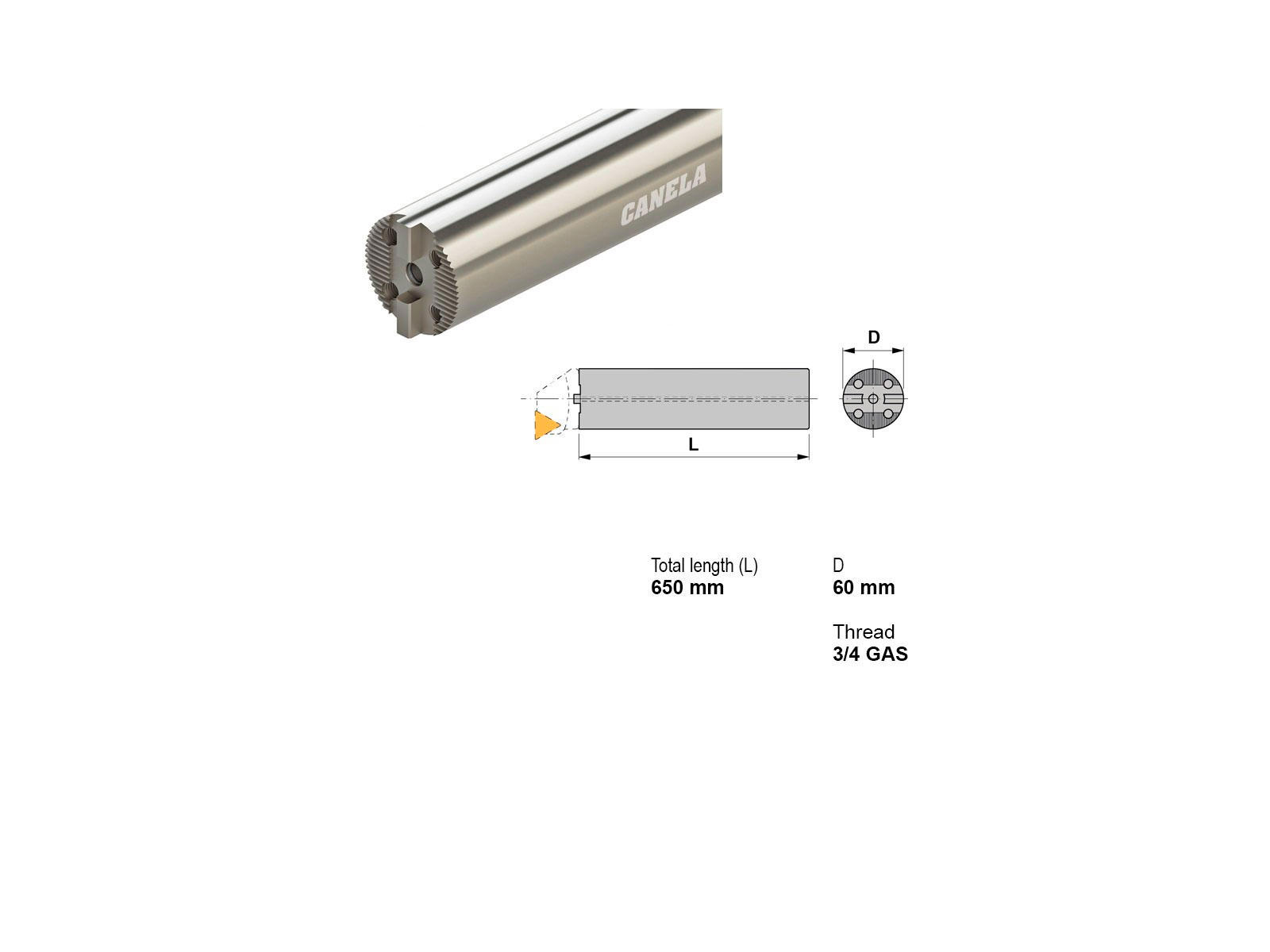 Canela borestang J60/650 er det perfekte værktøj til præcisionsboring. Med en længde på 650 mm og en diameter på 60,0 mm leverer den høj ydeevne og pålidelighed. Borestangen er udstyret med vibrationsdæmpning og køling for optimal drift og længere levetid. Gevindstørrelse G 3/4" sikrer nem integration i dine eksisterende maskiner.