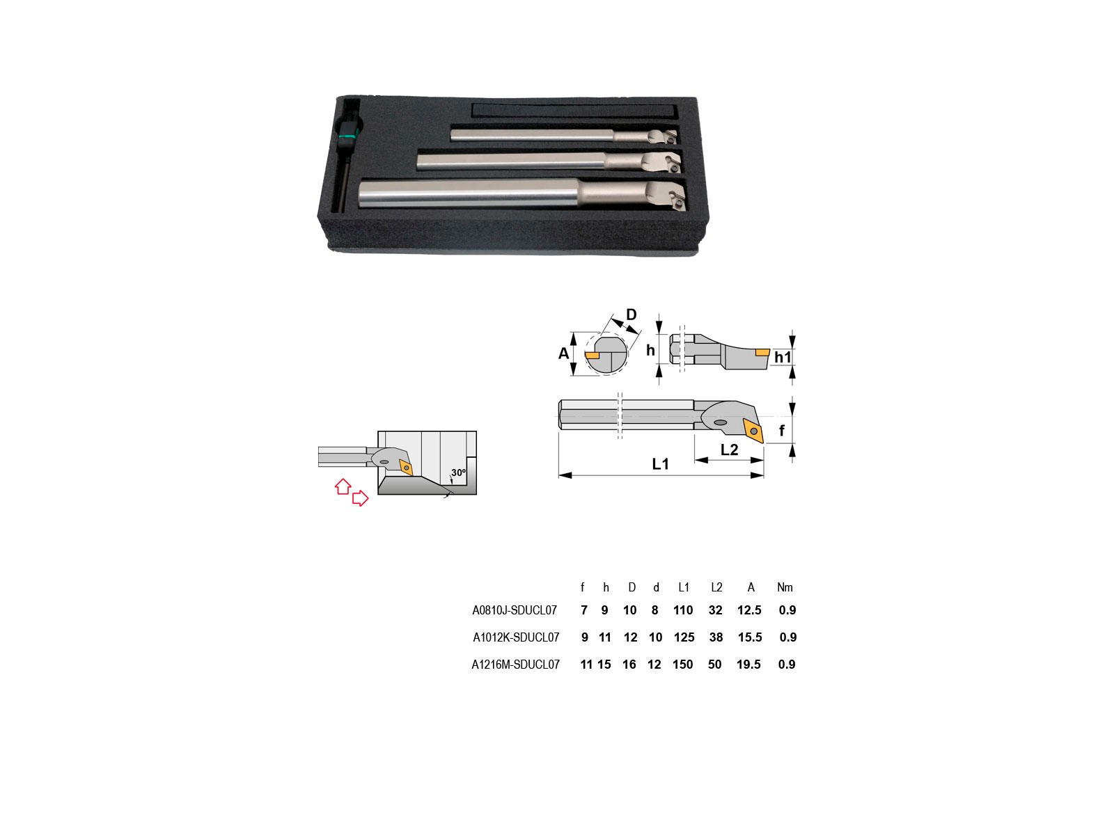 Canela SDUCL sættet indeholder tre udborestål optimeret til brug med DC..0702..-platter. Velegnet til præcis og effektiv udboring i industrielle drejeopgaver, hvor pålidelighed og køling er afgørende.